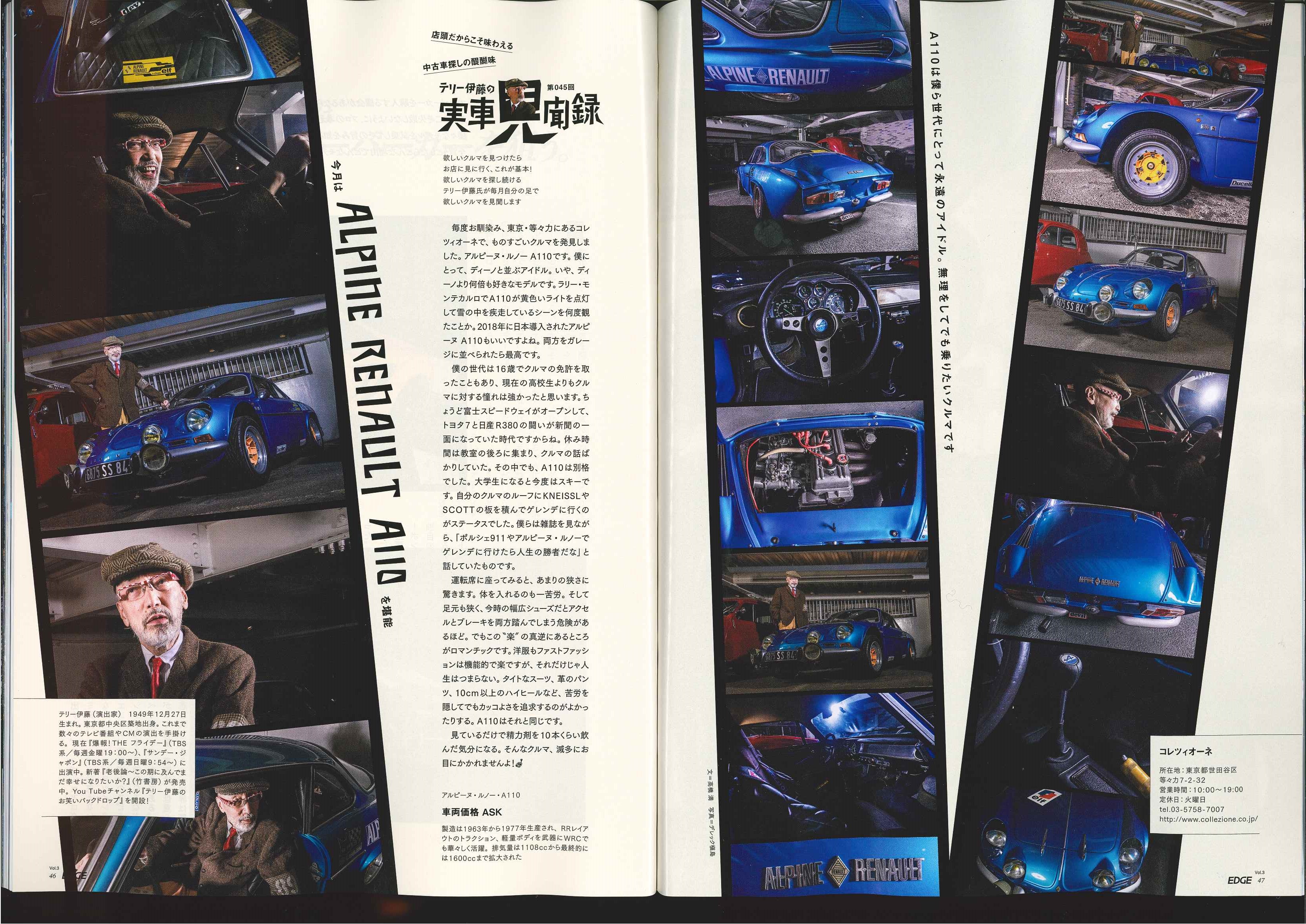 CarSensorEDGE!! カテゴリー : Pressroom 2021年2月2日 カーセンサーエッジ 32021MAR. 46p~47p 66p~71p 「テリー伊藤の実車見聞録」のコーナーにて 弊社商品車・アルピーヌA110が 出演しております!! 「テリー伊藤の実車見聞録」とは 欲しいクルマを見つけたら お店に見に行く、これが基本! 欲しいクルマを探し続けるテリー伊藤氏が 毎月自分の足で 欲しいクルマを見聞するコーナーです! そして、「名車への道」のコーナーにて 弊社商品車・フィアット500Cが出演しております!!