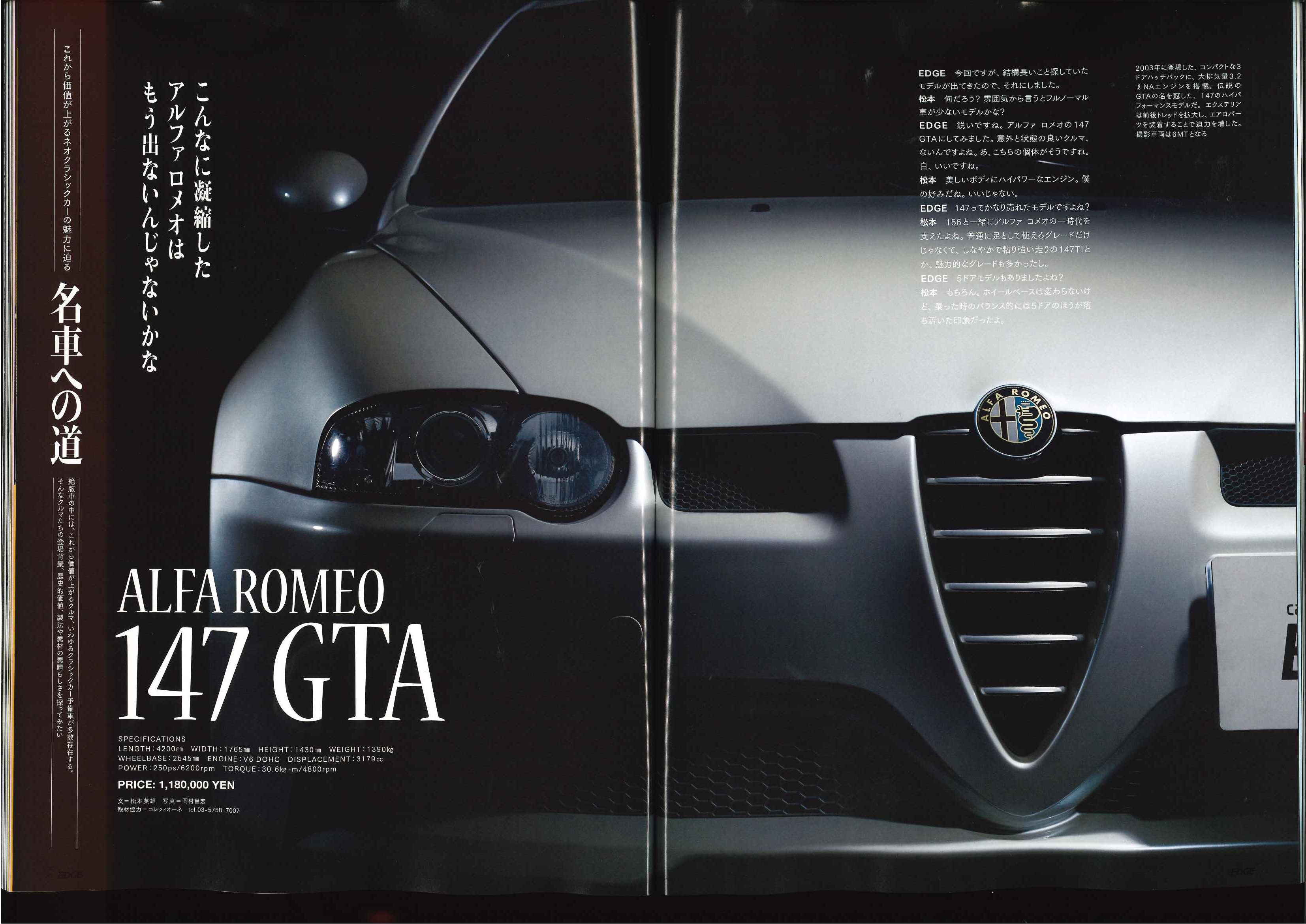 CarSensorEDGE!! カテゴリー : Pressroom 2020年9月25日 カーセンサーエッジ 112020NOV. 70p~75p 「名車への道」のコーナーにて 弊社商品車・アルファロメオ147GTAが 出演しております!!
