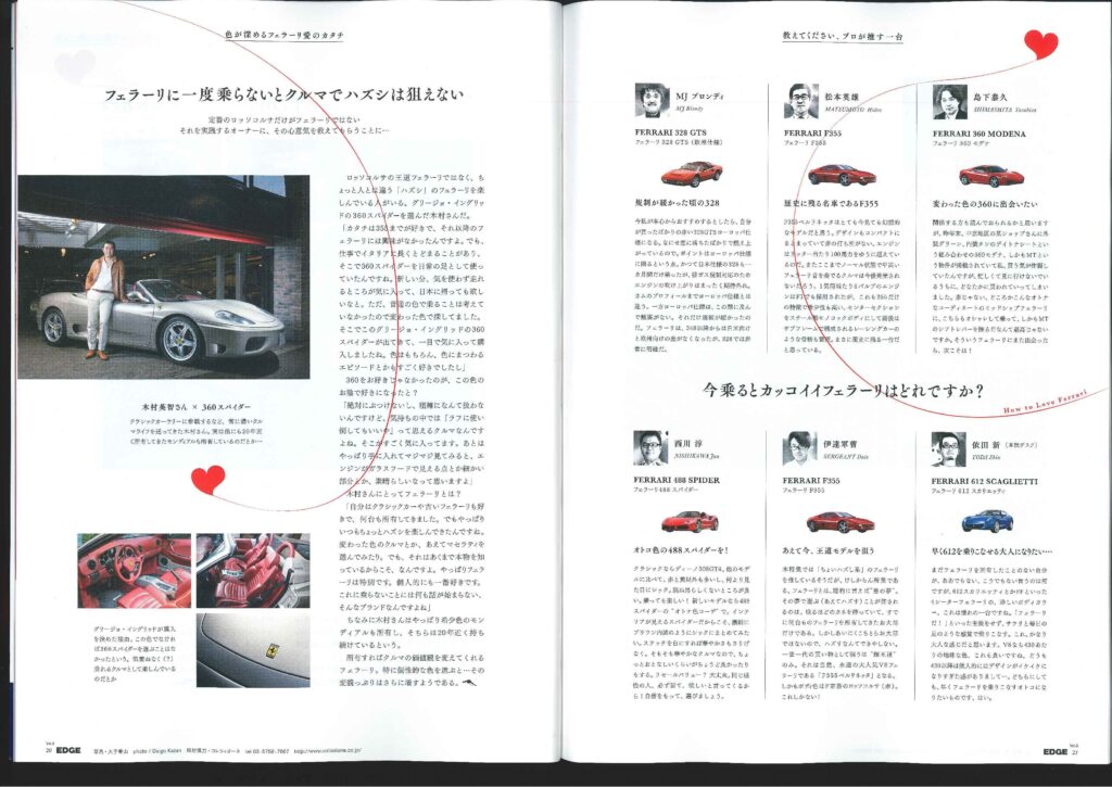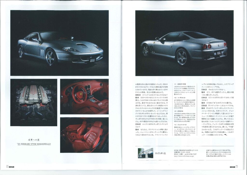 CarSensorEDGE!! カテゴリー : ニュース 2017年7月9日 20p74p~77p フェラーリの愛し方のコーナーにて 弊社お客様が出演しております!! 「名車への道」のコーナーにて 弊社商品車・フェラーリ575マラネロが 出演しております!!