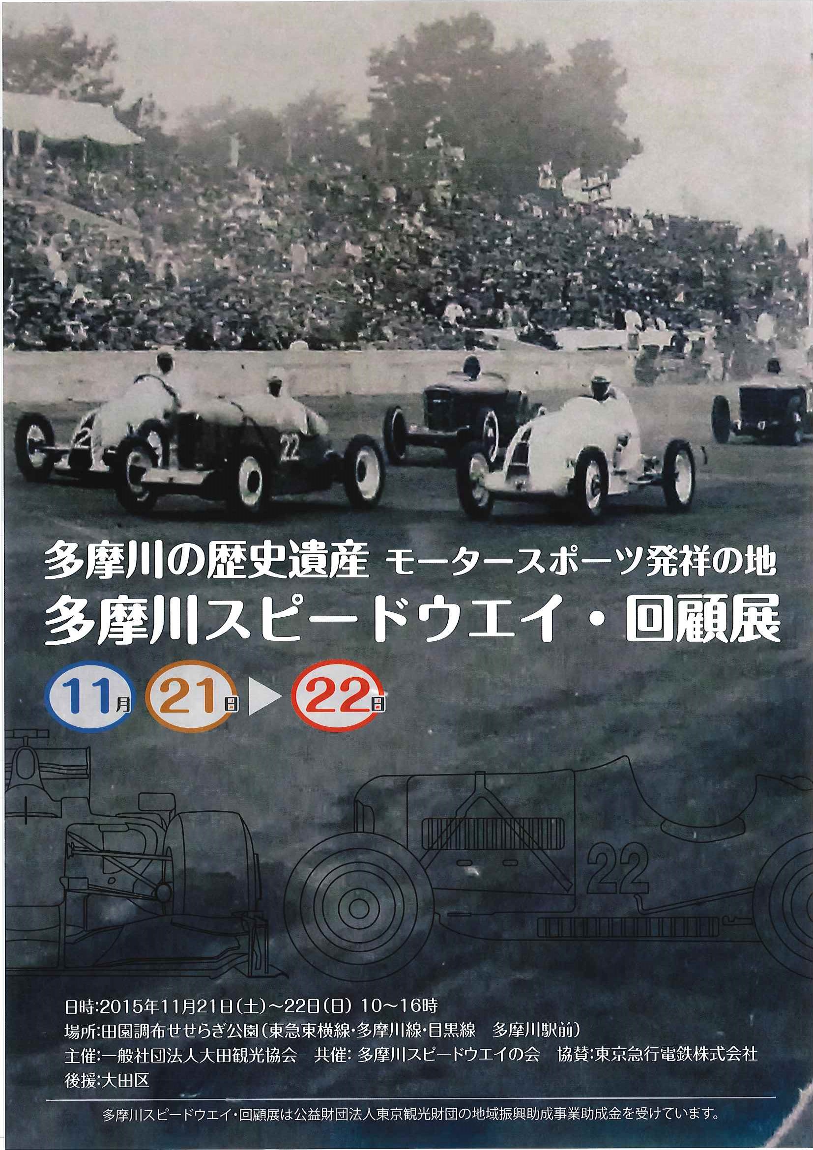 多摩川スピードウエイ・回顧展が開催されます! 1936年からスタートした「全日本自動車競走大会」の 写真展示や 第一回大会優勝車の展示など、 田園調布せせらぎ公園にて 11月21日、22日と行われます。 ご入場は無料です! 弊社にご案内パンフレットがございますので ご興味のある方は是非お立ち寄りくださいませ!! 日時 2015年11月21日(土)22日(日) 10時~16時 場所 田園調布せせらぎ公園 (東急東横線・多摩川線・目黒線 多摩川駅前) 主催 一般社団法人大田観光協会 共催 多摩川スピードウエイの会 協賛 東京急行電鉄株式会社 後援 大田区