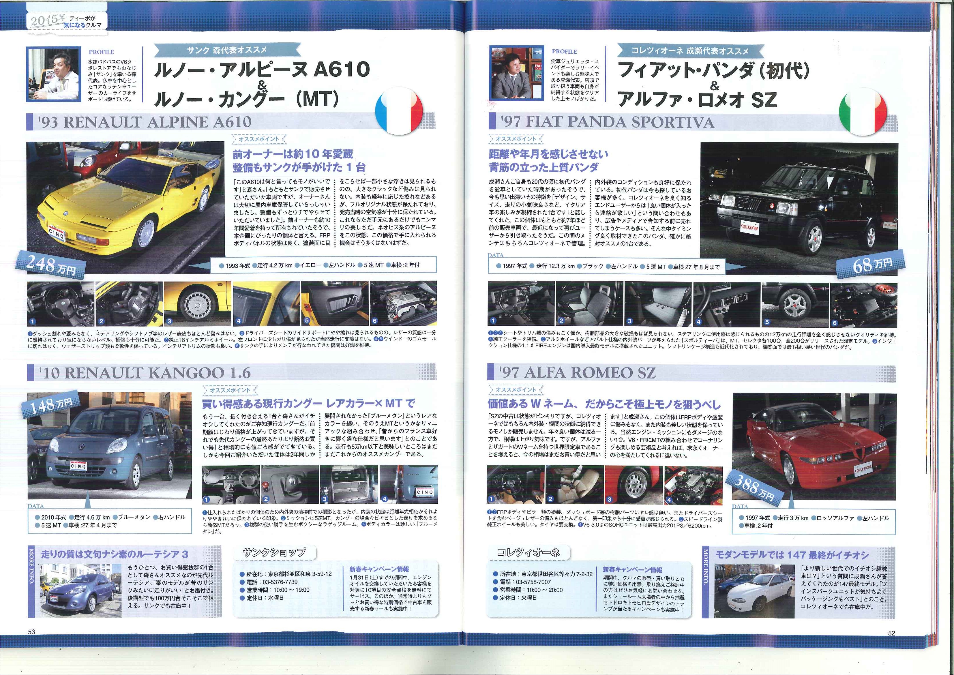 Tipo!! カテゴリー : Pressroom 2015年1月10日 ティーポNo308 2015年 2月号 50p~53p Tipo恒例の新春中古車企画、これから10年楽しめる絶対オススメ中古車2015!のコーナーにて取材を受けました!! 弊社商品車・アルファロメオSZ、フィアットパンダが出演しております!