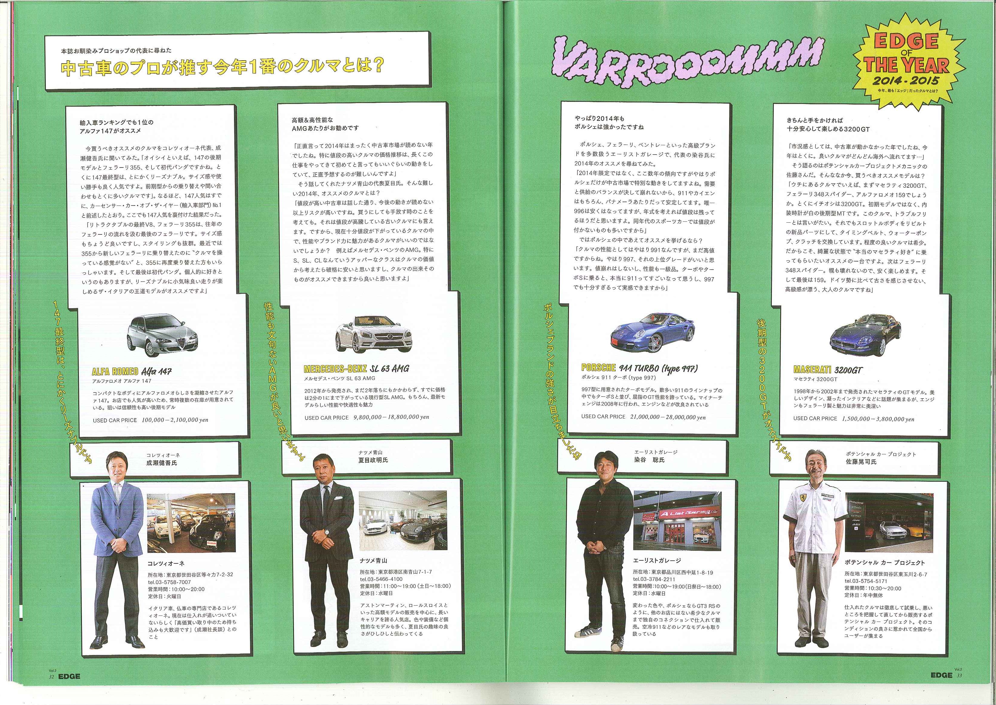 カーセンサーエッジ 022015 FEB. 14p~15p32p~33p EDGEOFTHEYEAR2014-2015!!! 今年ユーザーに一番人気だったクルマが決定! カーセンサー・カー・オブ・ザ・イヤー(輸入車部門) 今年No.1の輸入車になんとアルファロメオ147が選ばれました!! 弊社商品車・アルファロメオ147が出演しております! 皆様ありがとうございました!!! そして、本誌お馴染みプロショップの代表に尋ねた 「中古車のプロが推す今年一番のクルマとは?」 のコーナーにて取材を受けました!