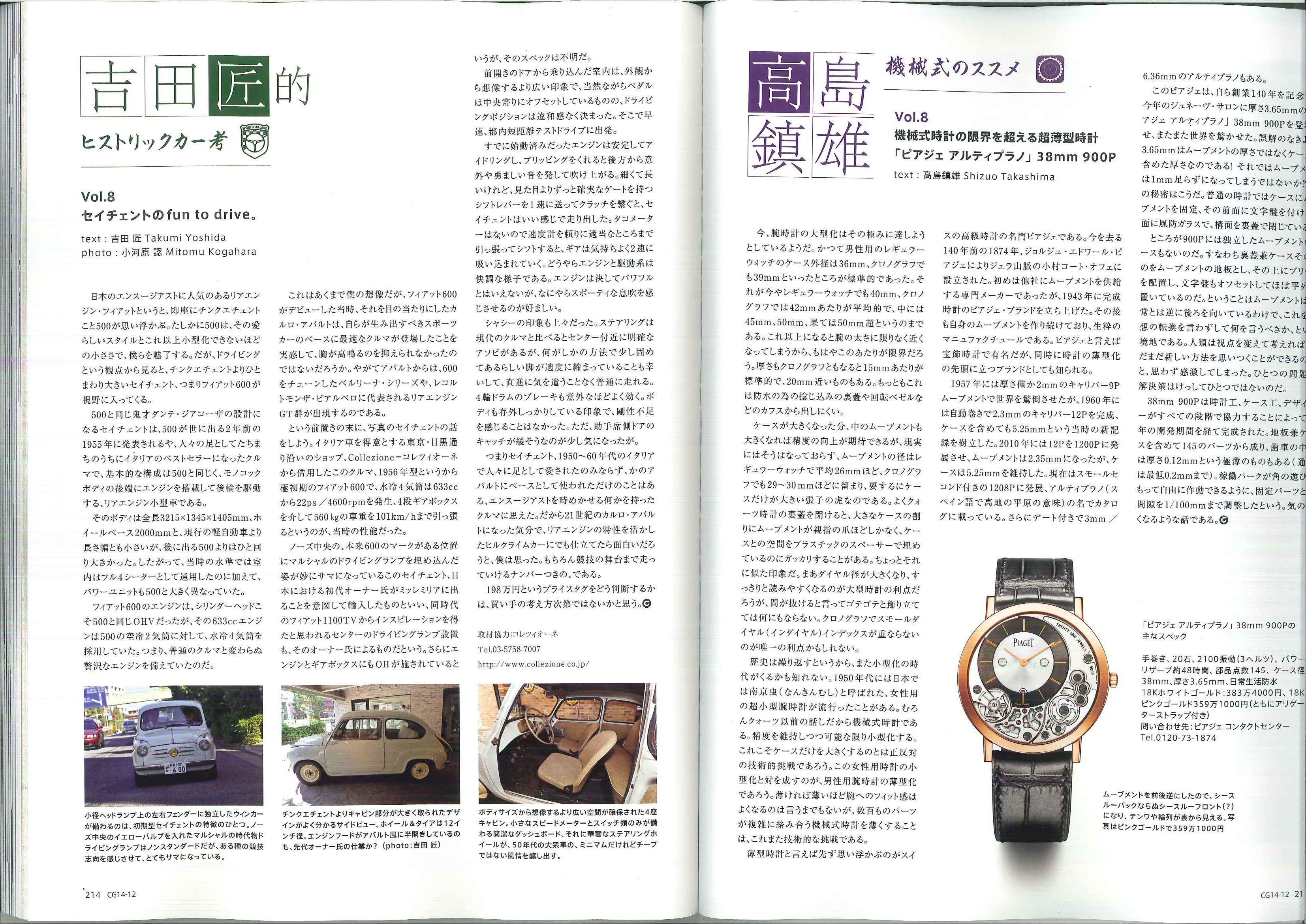 カーグラフィック 2014年12月 No.645 214p 吉田匠的 ヒストリックカー考 Vol.8セイチェントのfuntodriveのコーナーにて 取材を受けました! 弊社商品車・フィアット600が出演しております!