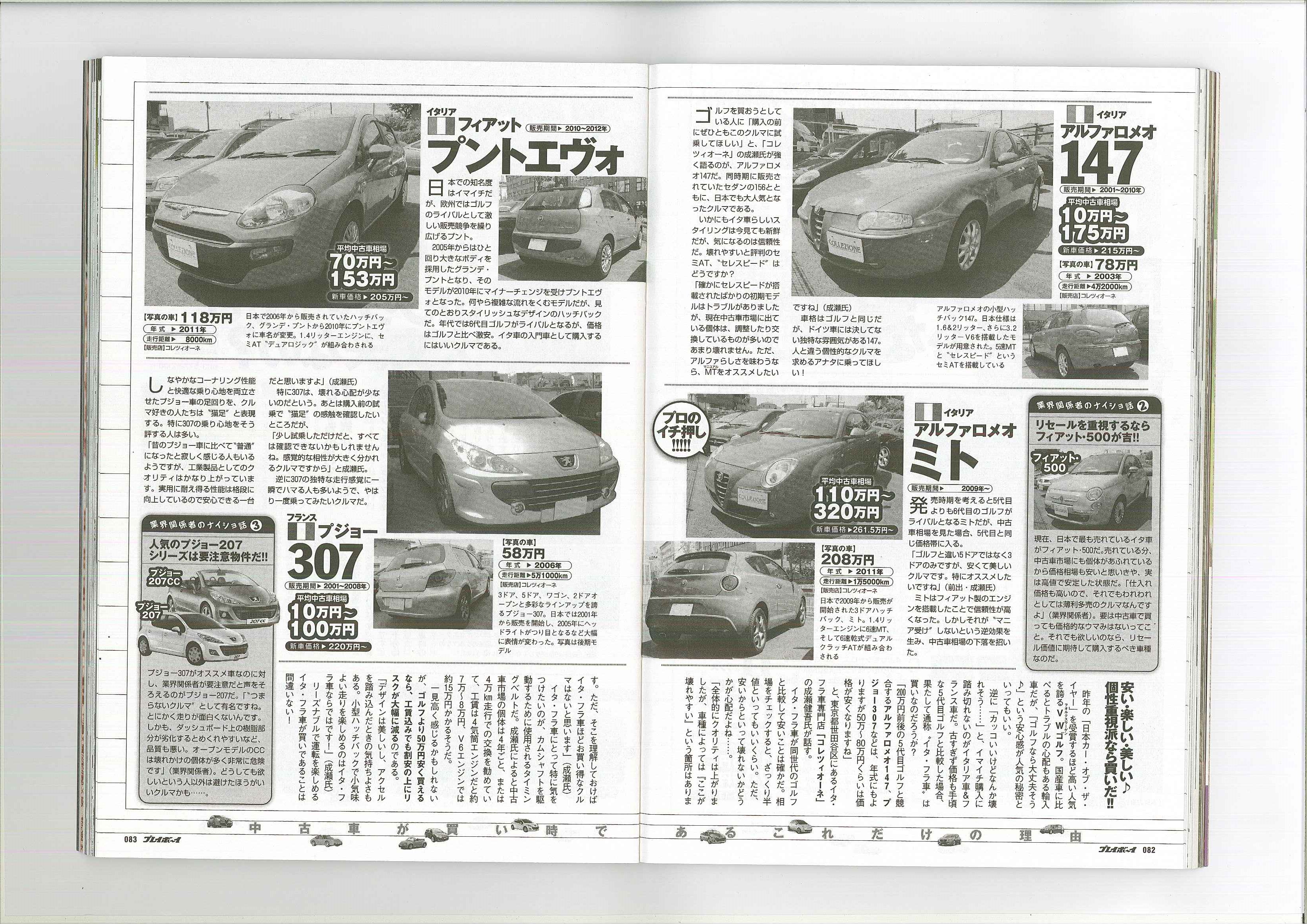 プレイボーイ!! カテゴリー : Pressroom 2014年5月23日 プレイボーイ 集英社 2014 JUN 2nd no.2281p~83p 「超以外!!消費税が上がった直後の今こそ中古車が買い時であるこれだけの理由」のコーナーにて取材を受けました。本誌では16ぺージにわたり、イタリア車、フランス車は勿論、さまざまなお車が特集されております!!