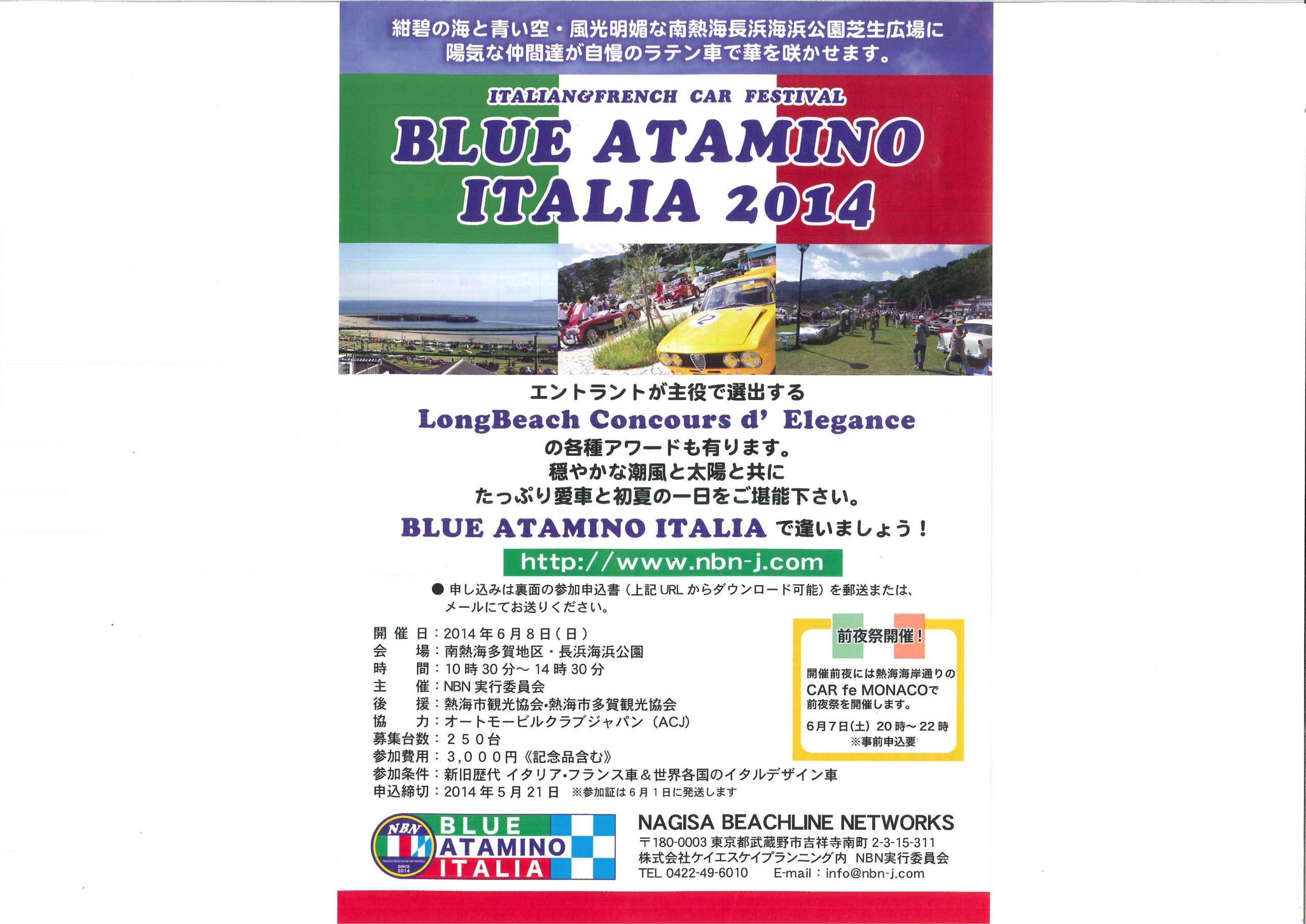 BLUE ATAMINO ITALIA 2014!! カテゴリー : ニュース 2014年5月2日 会場 長浜海浜公園 時間 10時30分~14時30分 主催 NBN実行委員会 後援 熱海市観光協会・熱海市多賀観光協会 イタリアン&フレンチカー フェスティバルが開催されます。 皆様も愛機と一緒に南熱海長浜海浜公園に集合しませんか?! 弊社に参加申込書がありますのでお気軽にお立ち寄りください。