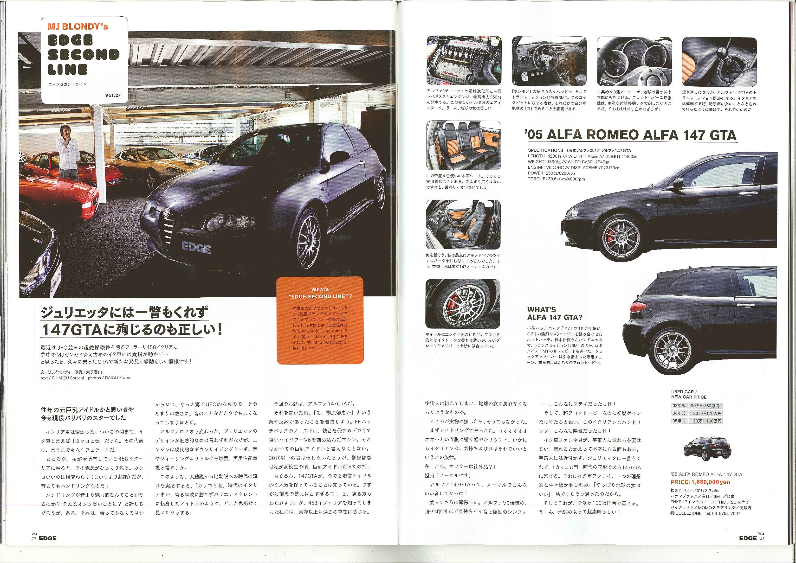 CarSensorEDGE!! カテゴリー : Pressroom 2013年7月1日 カーセンサーエッジ 2013 AUG 50p~51p 「エッジセカンドライン」のコーナーにて弊社商品車・アルファロメオ147GTAが出演しております!!