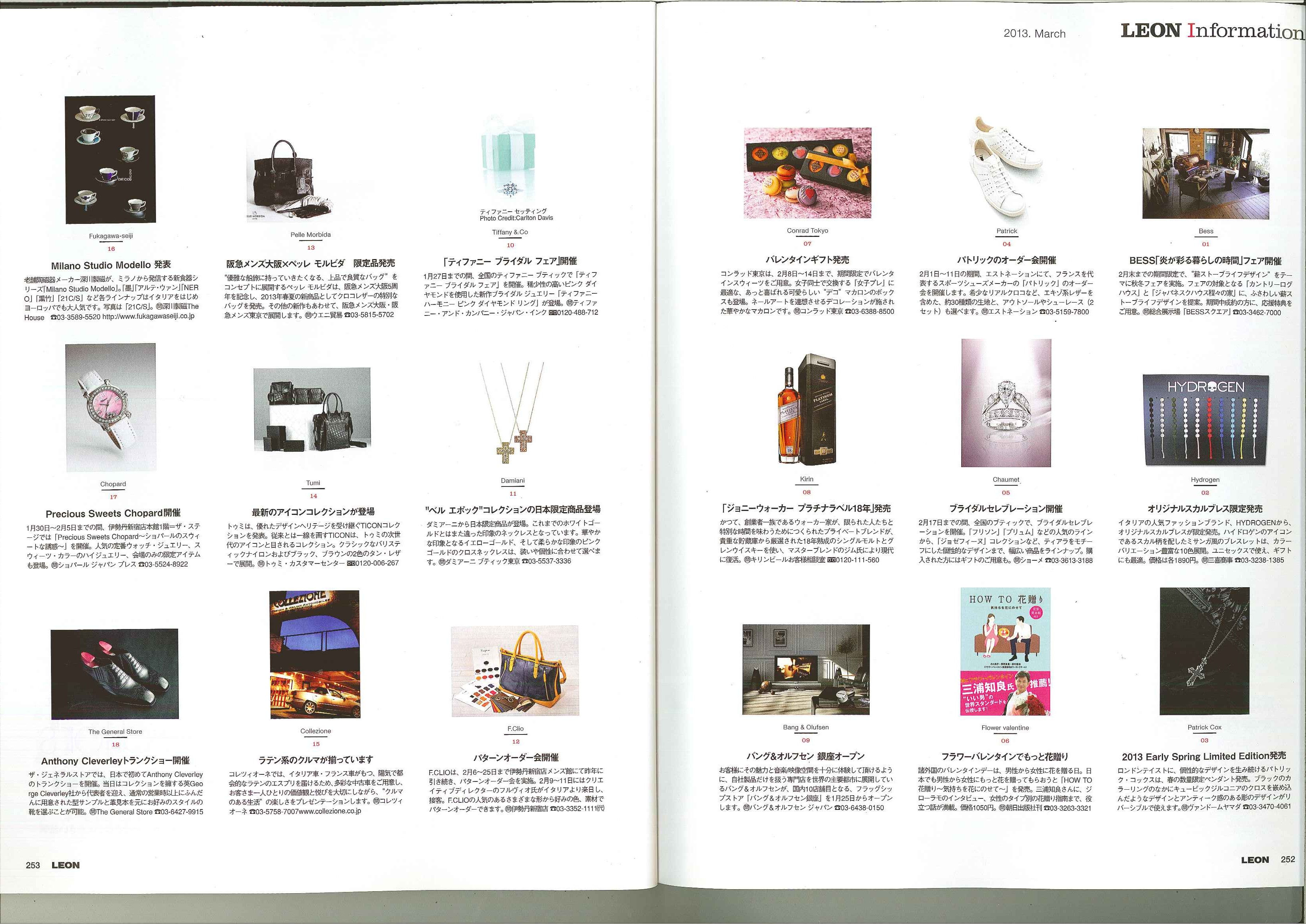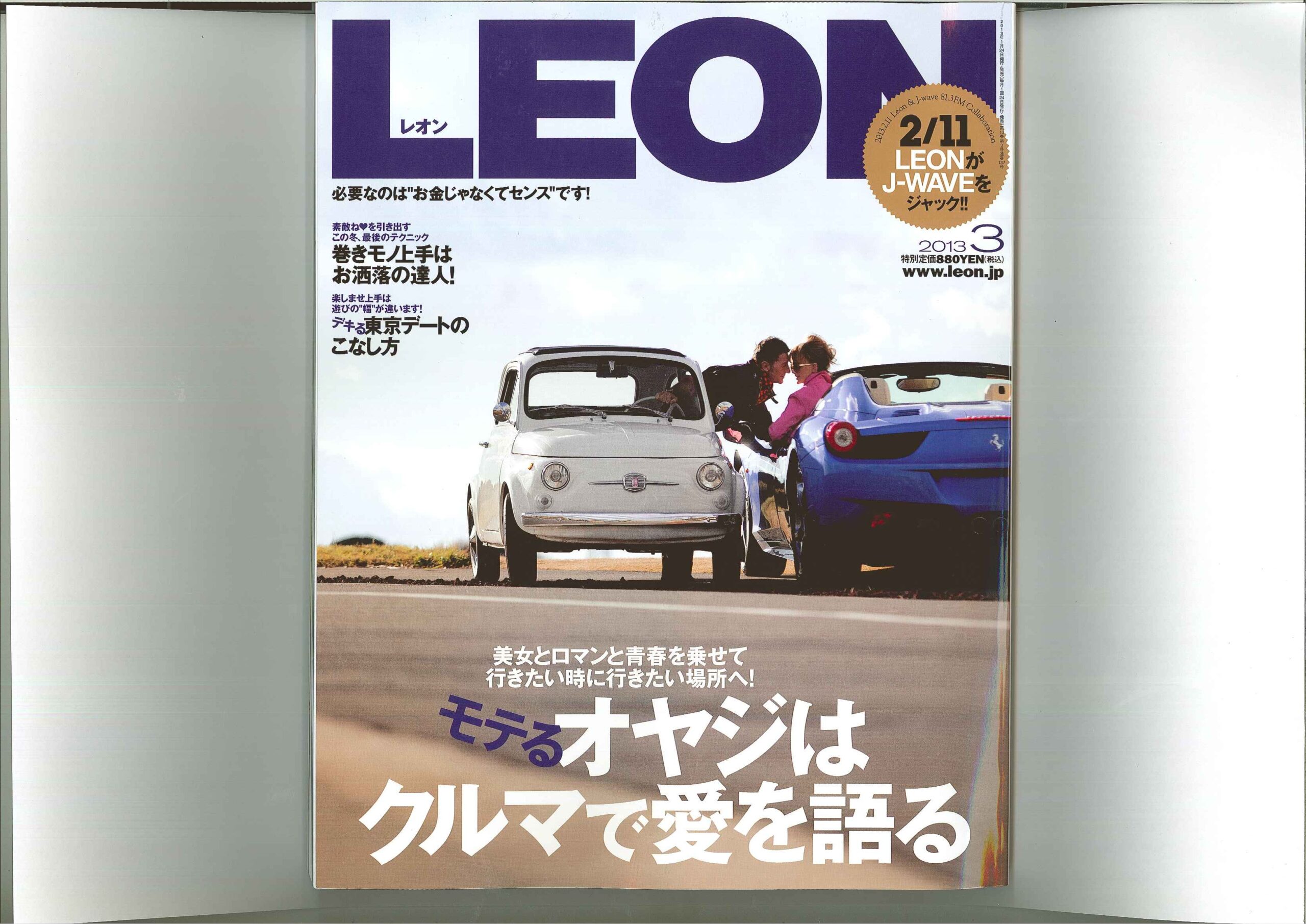 LEON!! カテゴリー : Pressroom 2013年1月25日 レオン 2013 3月号 表紙 253p 表紙にて弊社商品車・フィアット500が出演しております! 表紙のメッセージとしては、たった18馬力がセンスとコナシで570馬力を口説いてしまう「お金じゃなくてセンスです」というメッセージのようです!!