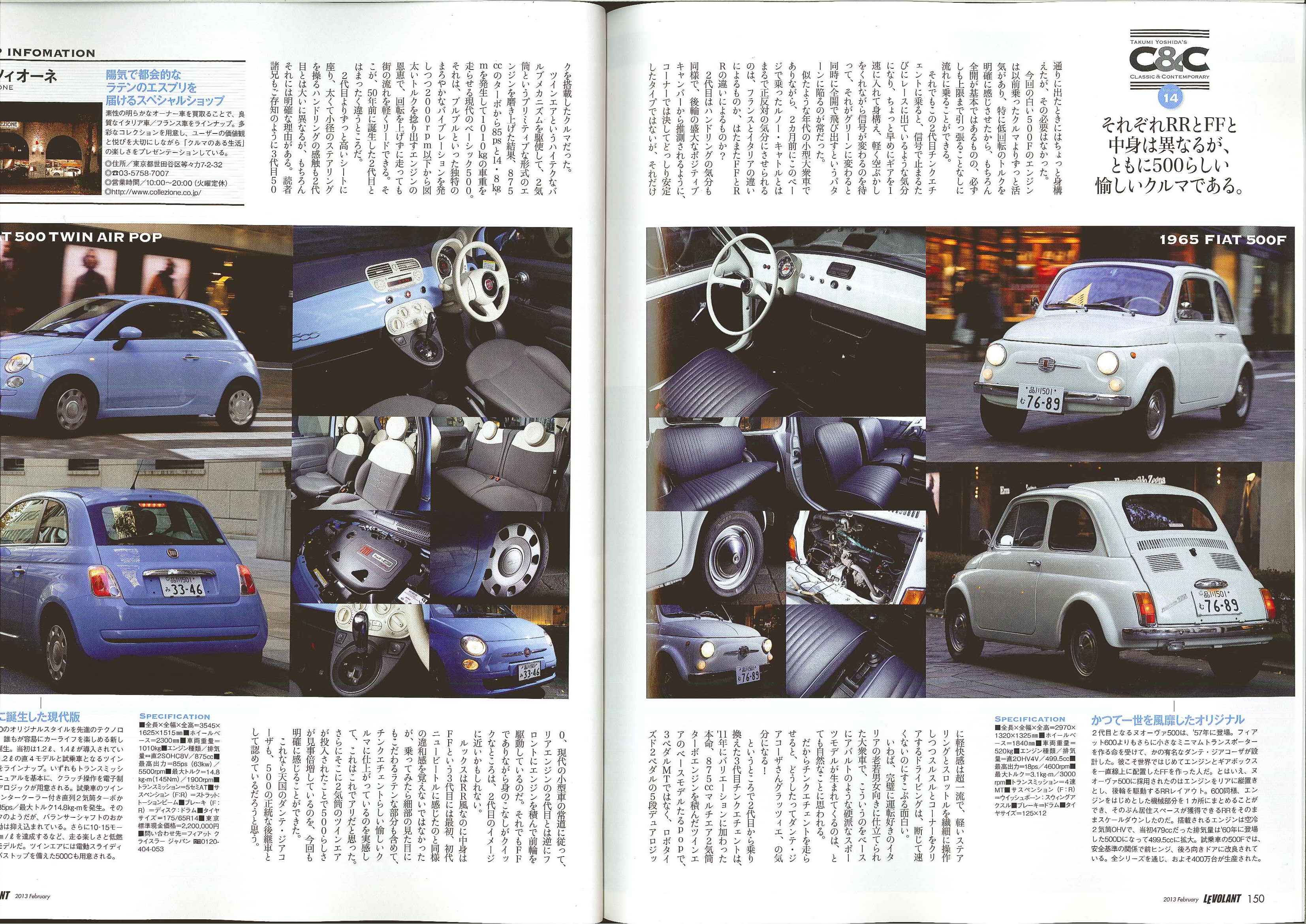 LE VOLANT!! カテゴリー : Pressroom 2012年12月27日 ル・ボラン 2月号 NO.431148P~151P 吉田匠氏のC&Cのコーナーにて弊社商品車・フィアット500Fが出演しております。誌面では新旧で比較されております!!