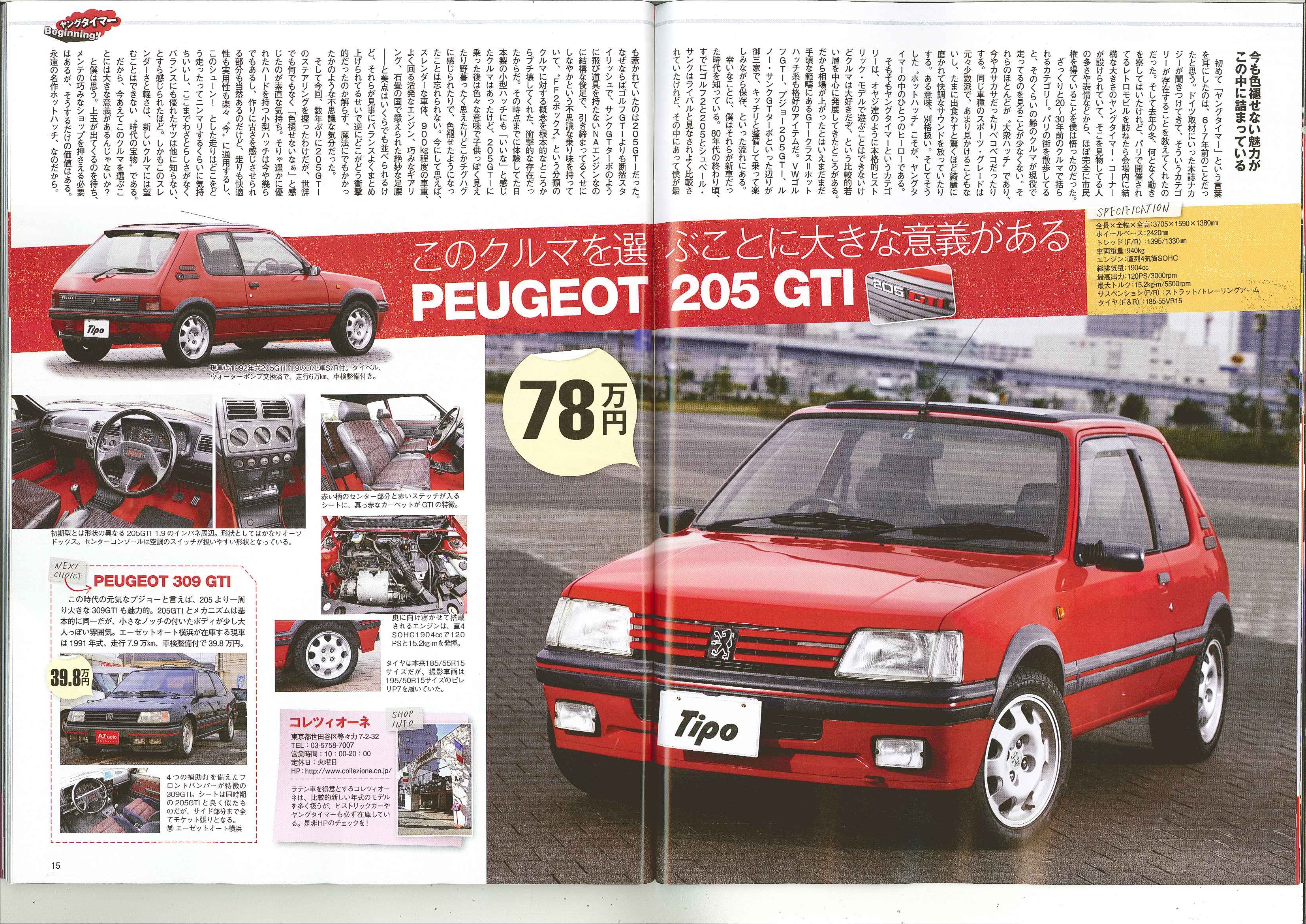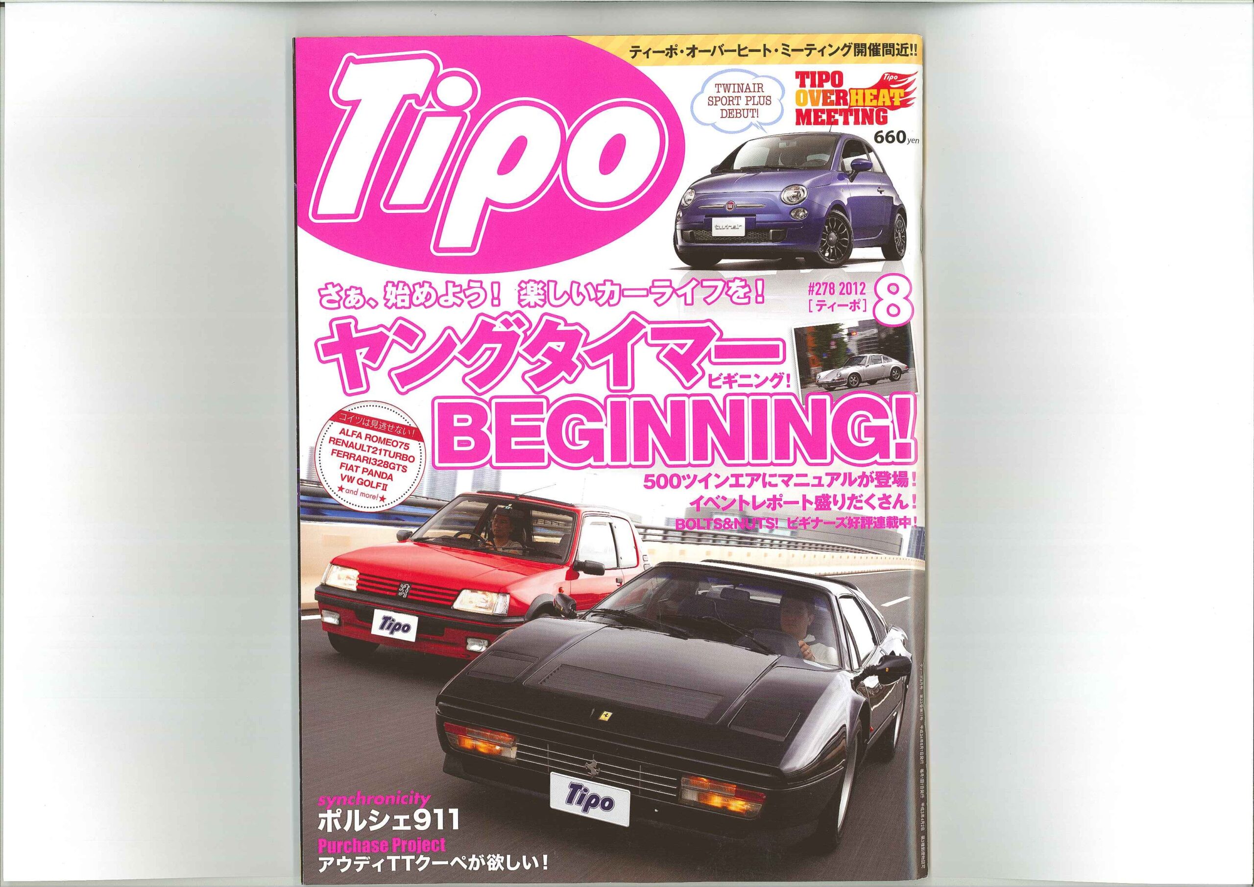 Tipo2012年 No278 8月号 表紙 11p~15p  ヤングタイマー BEGINNING!のコーナーにて弊社商品車・プジョー205GTIが出演しております。ティーポのイチ押しのクルマ達が出演してます!!