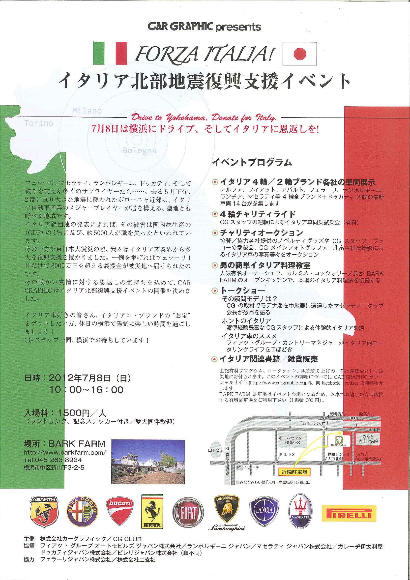 FORZAITALIA!! カテゴリー : ニュース 2012年7月4日 主催 ㈱カーグラフィック・CGクラブ 7月8日は横浜にドライブ、そしてイタリアに恩返しを!! イタリアの4輪、2輪各メーカーブランドが横浜BARK FARMに集結します! 弊社にパンフレットがございますので 是非お立ち寄りくださいませ!!