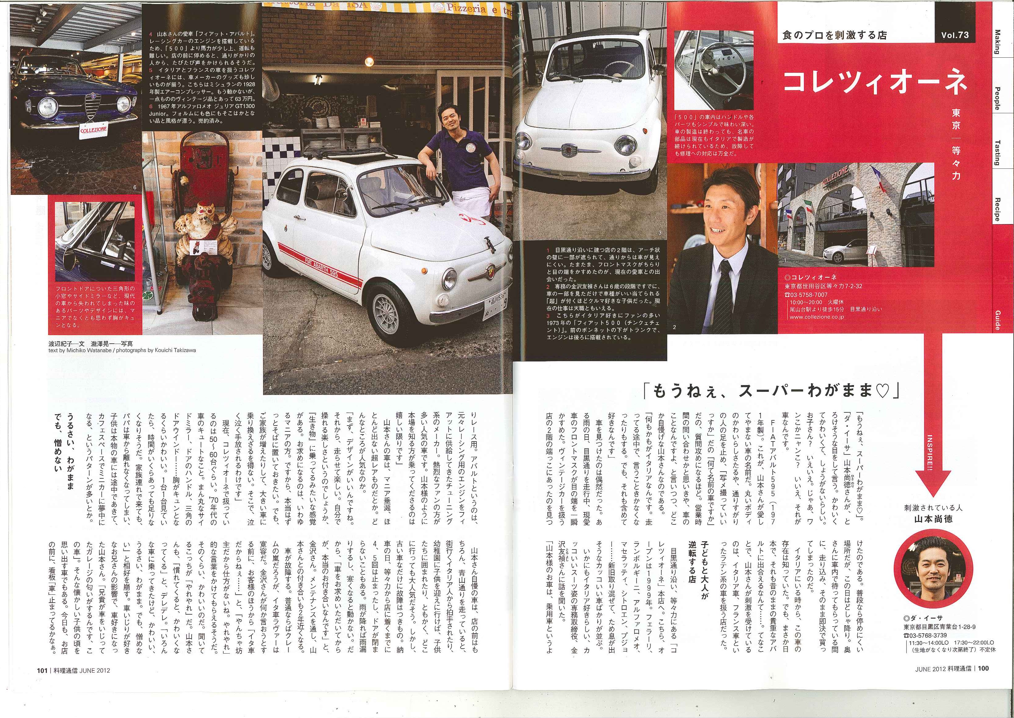 料理通信にて取材されました!! カテゴリー : Pressroom 2012年5月5日 料理通信 2012年 6月号 100p~101p 「食のプロを刺激する店」のコーナーにて ピッツエリアエトラットリアダイーサの 山本様よりご紹介いただき取材を受けま した!! ダ・イーサ http://www.da-isa.jp/index.html