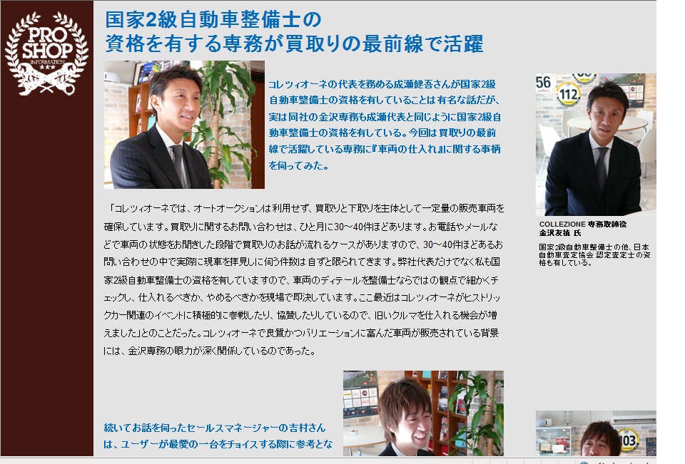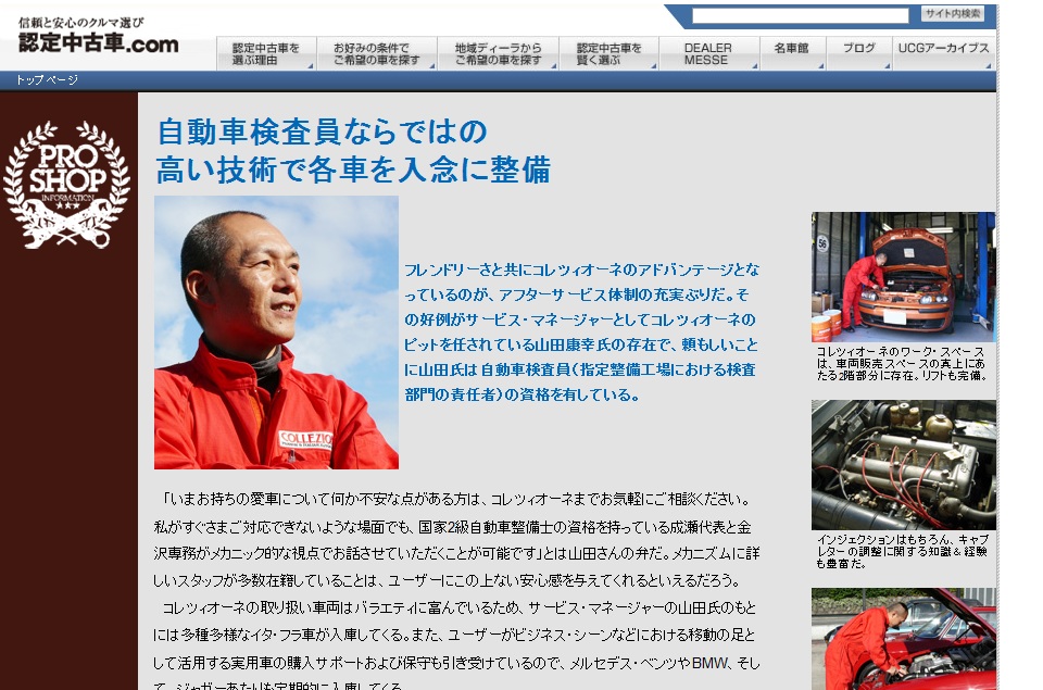認定中古車.comにて紹介していただきました!! カテゴリー : Pressroom 2010年12月24日 認定中古車.comの名車館「プロショップインフォメーション」のコーナーにて弊社及び弊社スタッフの紹介をしていただきました! 下記のURLよりご覧下さい。 http://www.ninteicyukosha.com/proshop_info/collezione/1012/1.asp