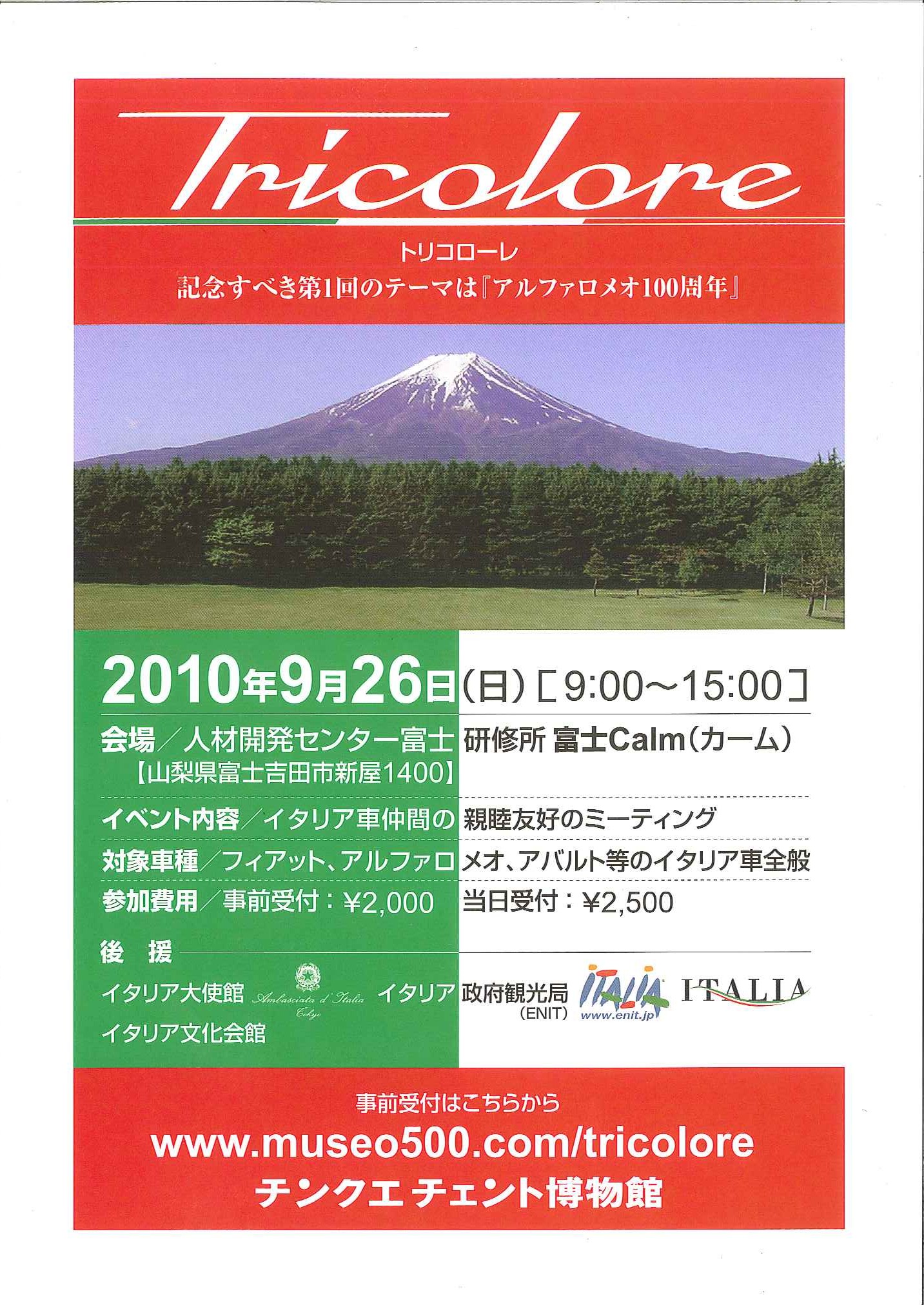 イタリア車仲間の親睦友好のミーティングで記念すべき第1回のテーマは「アルファロメオ100周年」です!! 開催日 2010年9月26日(日) 開催場所 人材開発センター富士研修所 富士Calm(カーム) 対象車種 イタリア車全般 参加費用 事前受付¥2000 当日受付¥2500 イベント後援 イタリア大使館 イタリア政府観光局(ENIT) イタリア文化会館 弊社にご案内パンフレットがございますので お気軽にお申し付け下さい。 webからの事前受付は下記URLより御願い致します。 www.museo500.com/tricolore