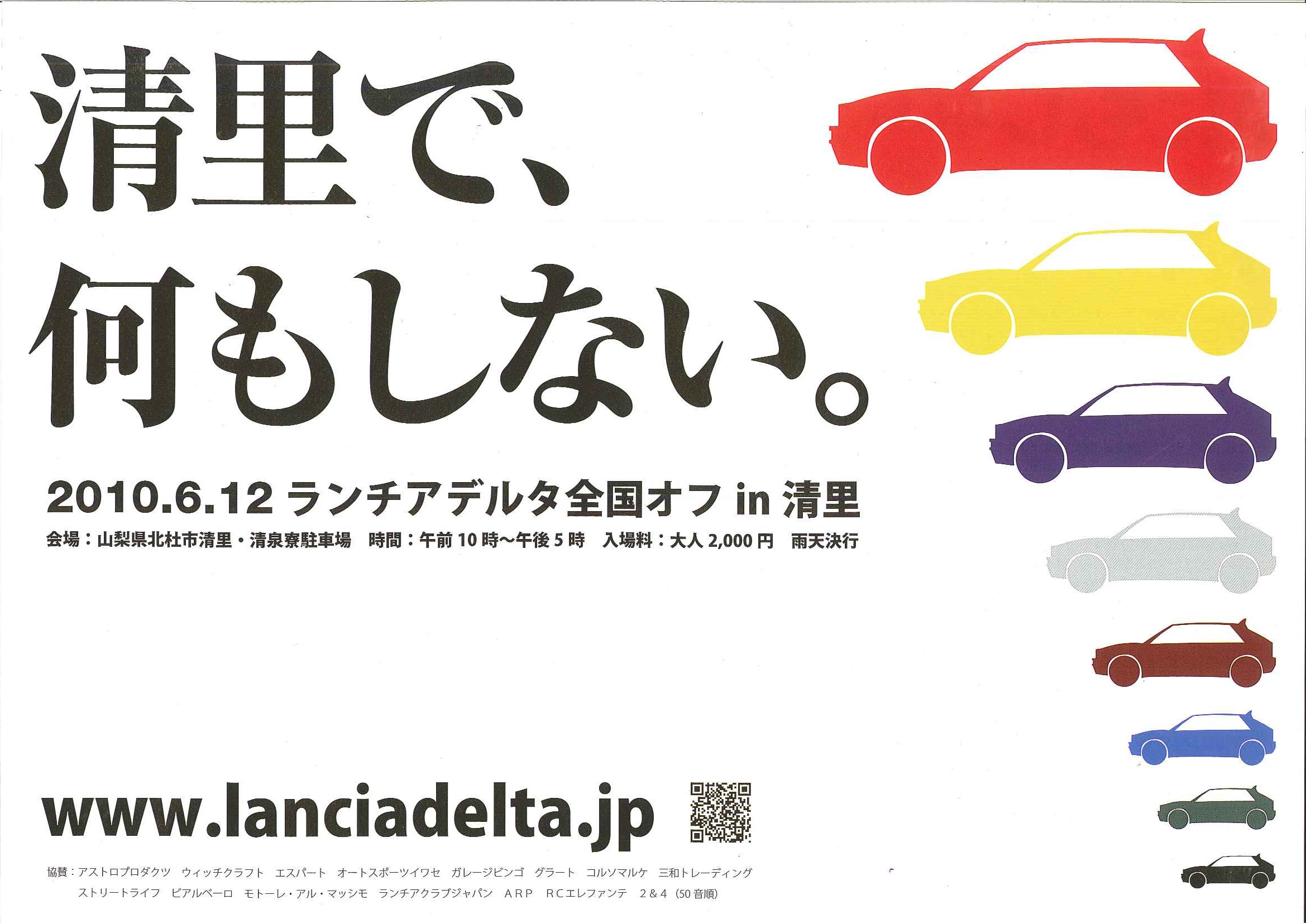 清里で、何もしない。2010.6.12ランチアデルタ全国オフin清里! カテゴリー : ニュース 2010年4月16日 時間:午前10時~午後5時 雨天決行 いよいよ本日より 2010ランチアデルタ全国オフのエントリー受付がスタートいたしました! 弊社にご案内パンフレットがございますので お気軽にお申し付けくださいませ。 公式サイト http://www.lanciadelta.jp/
