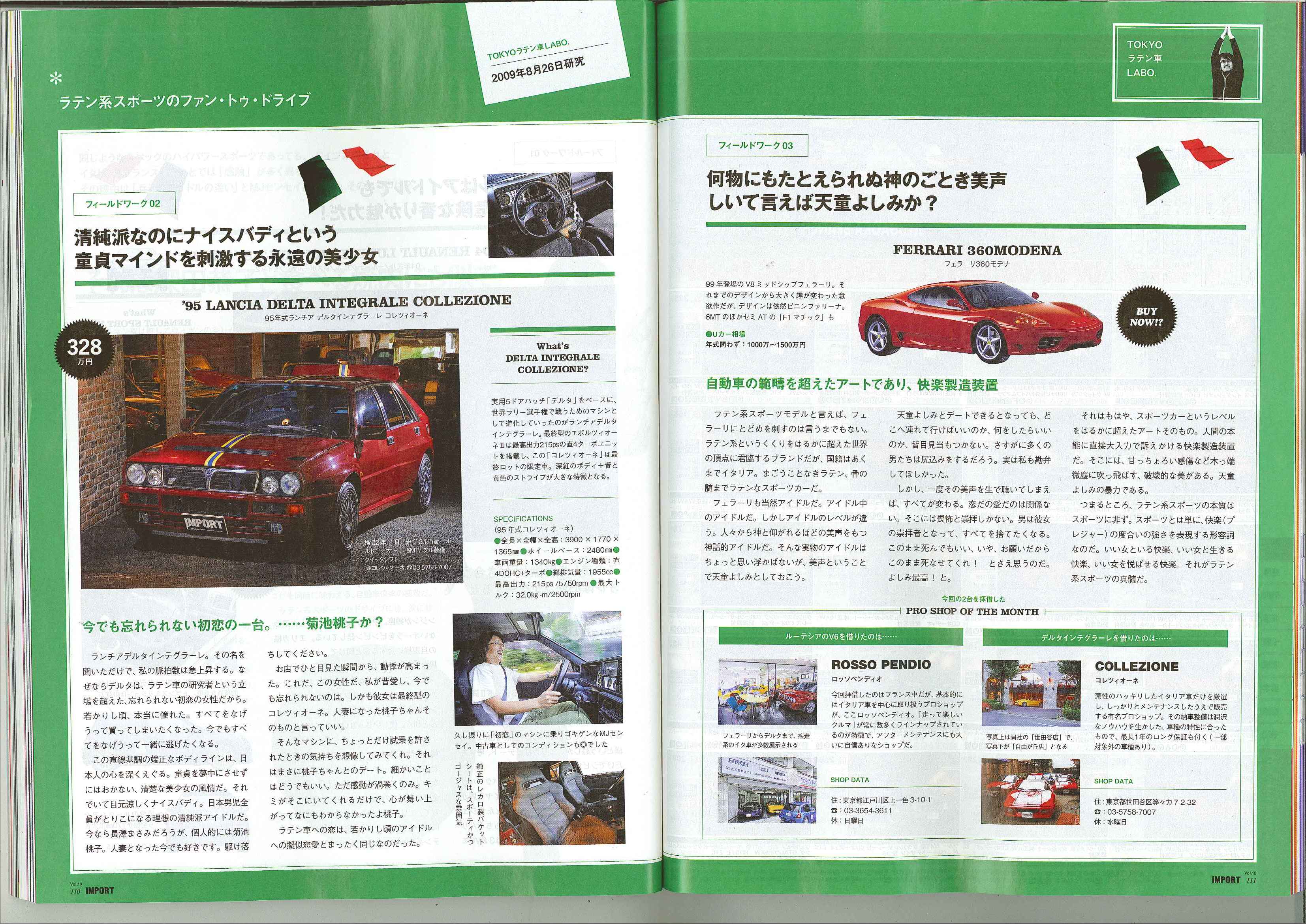 import Carsensor2009 10月号 110p~111p TOKYOラテン車LABO「なぜ、ある種の人はラテン系スポーツに熱狂するのか?」のコーナーに弊社商品車・ランチアデルタインテグラーレ コレッツィオーネが出演しております! インプレッションは日本文芸家協会会員のMJブロンディ氏です!!