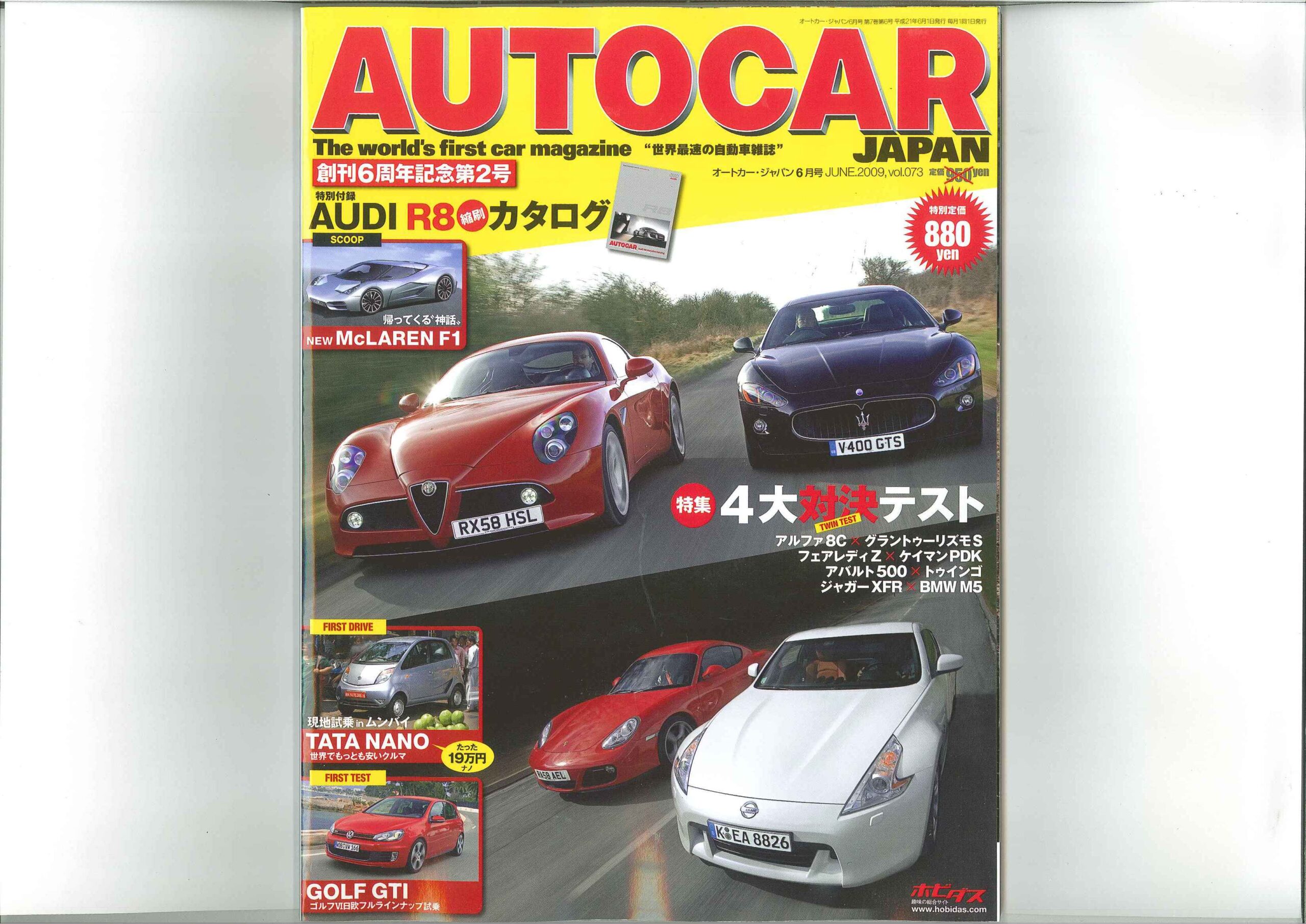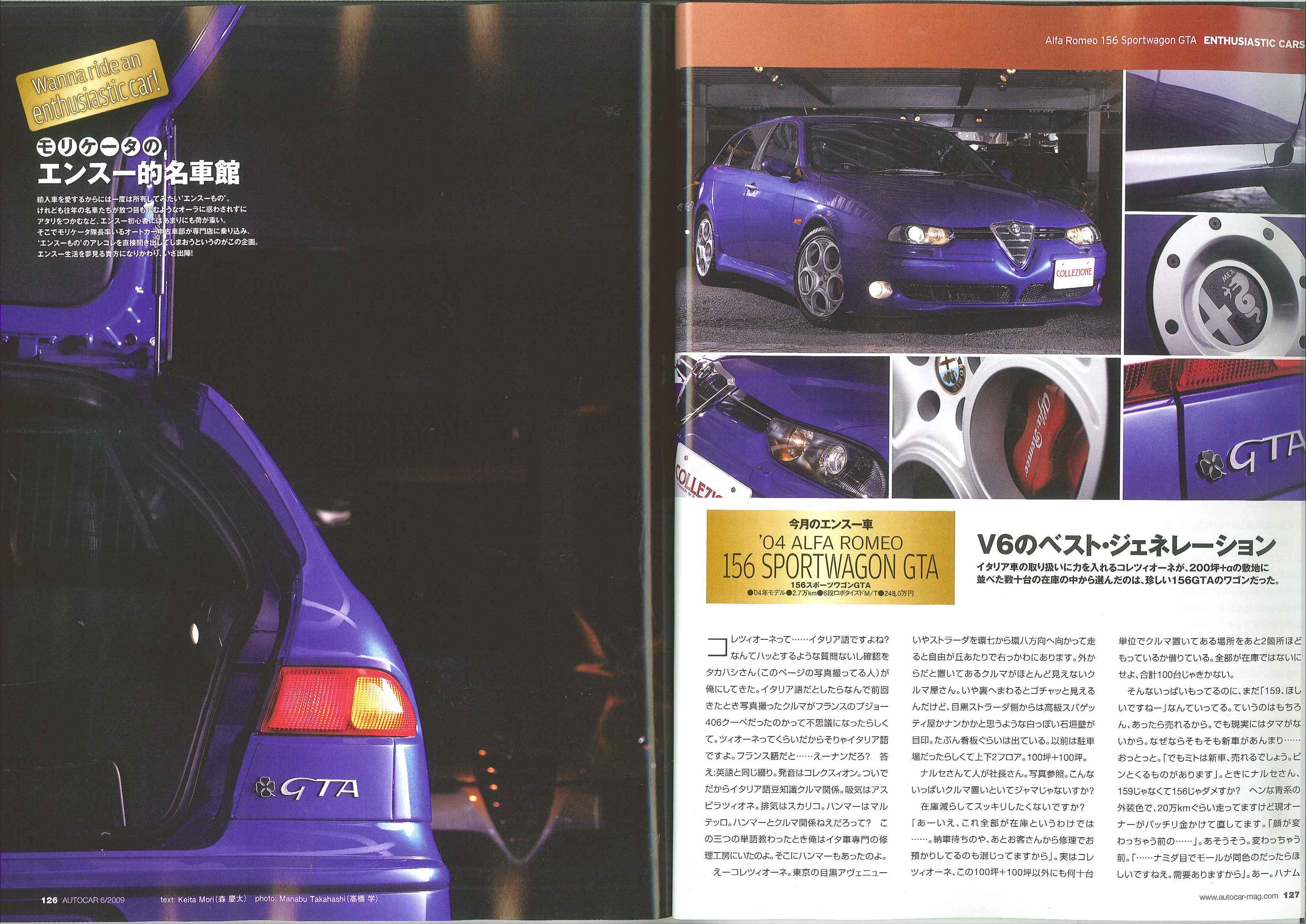AUTOCARvol.0732009.6月号 創刊6周年記念第2号 126p~129p 「モリケータのエンスー的名車館」のコーナーにて取材を受けました。弊社商品車・アルファロメオ156GTAスポーツワゴンも出演しております!誌面上ではアルファロメオ8C、マセラティグラントゥーリズモS、アバルトチンクエチェント、ルノートゥインゴ133カップが対決しております!!