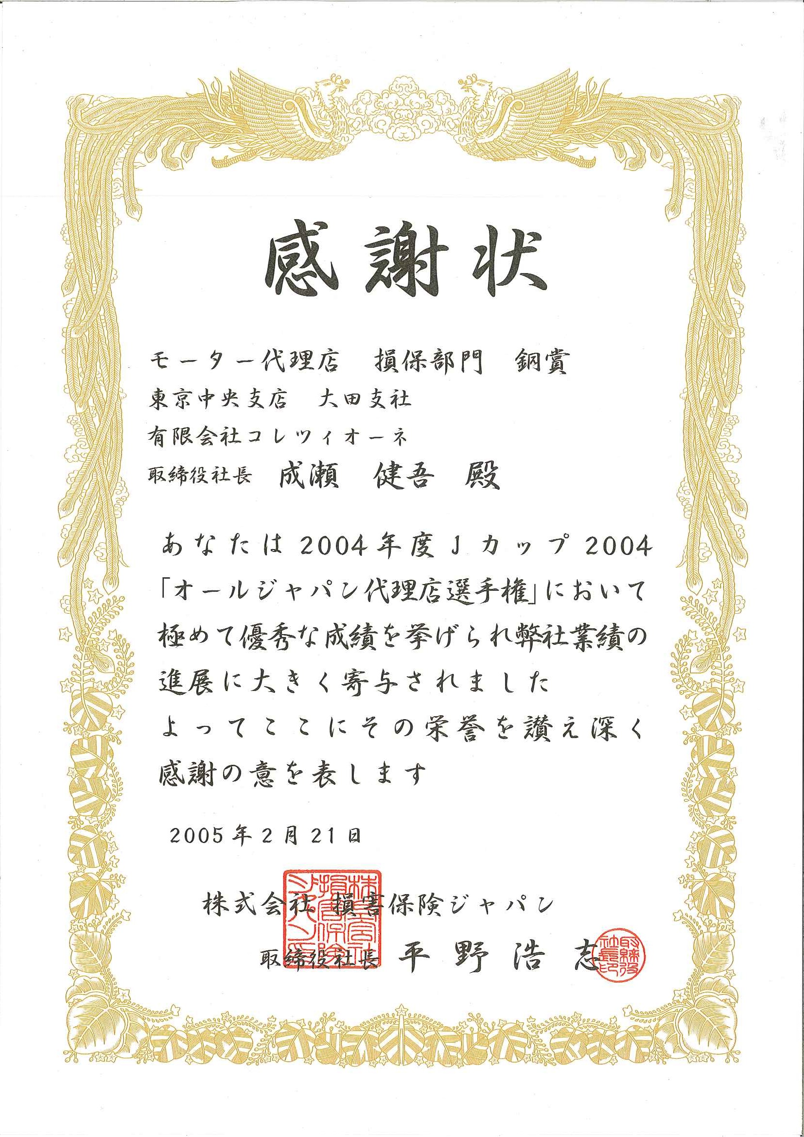 2004年度Jカップ「オールジャパン代理店選手権」にて 損保部門の銅賞に入賞し、㈱損害保険ジャパン (取締役社長 平野浩二)様より 感謝状をいただきました。 皆様のご愛顧、心より感謝申し上げます。