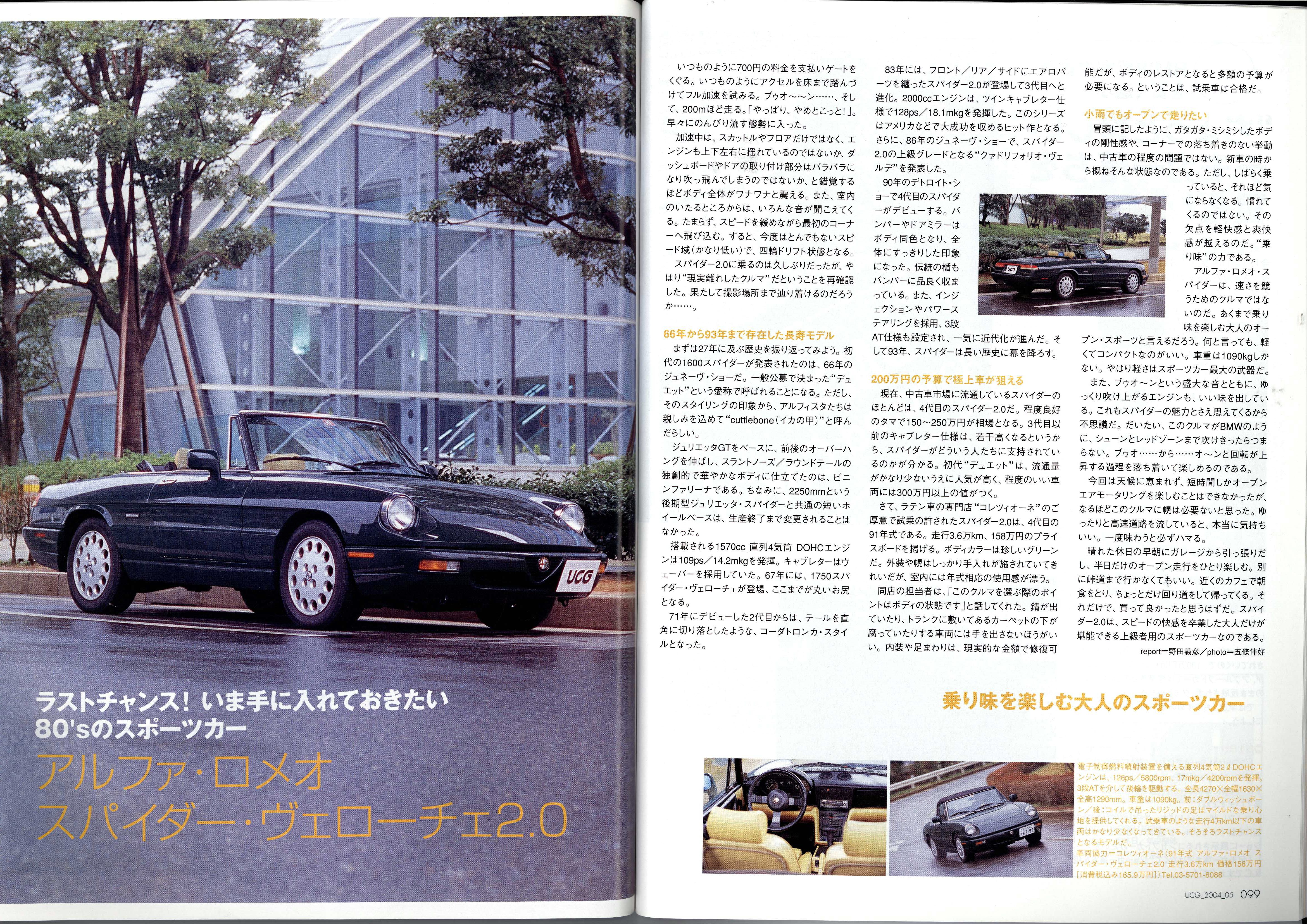 UCG2004年5月号 VOL42 98p~99p 「ラストチャンス!いま手に入れておきたい 80’sのスポーツカー」のコーナーにて 弊社商品車・アルファロメオスパイダー・ベローチェが 出演しております。