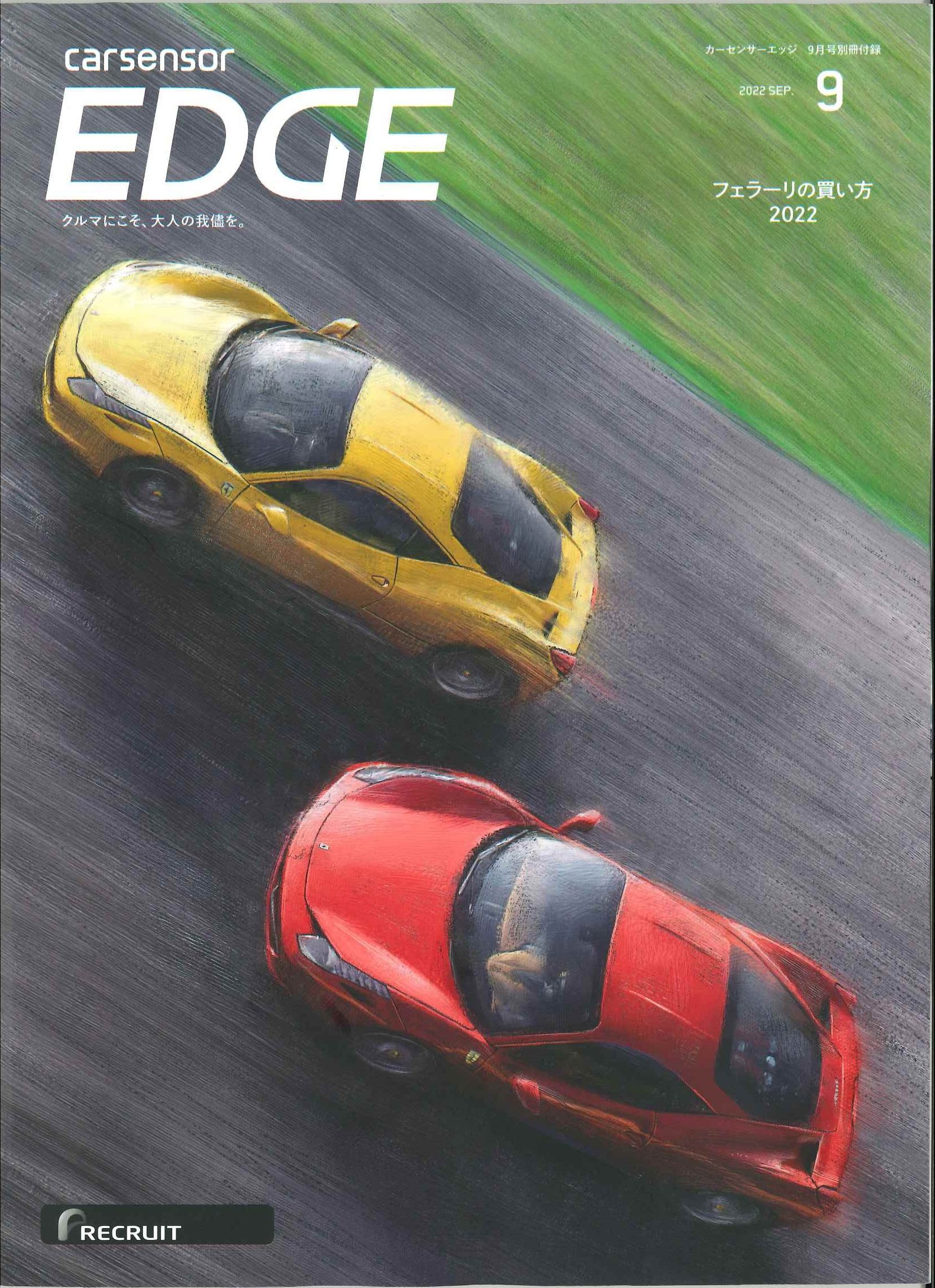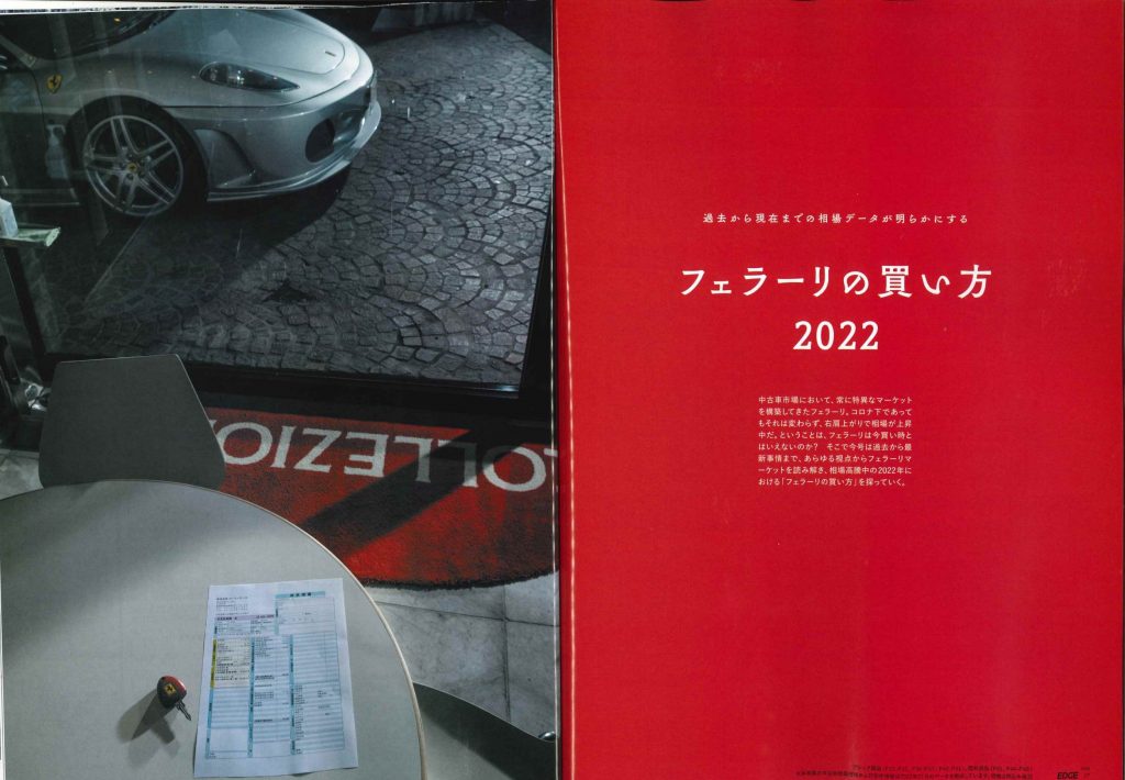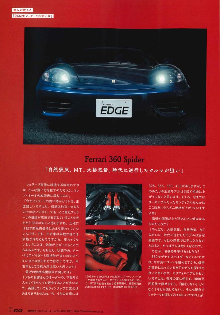 carsensor EDGE カテゴリー : Pressroom 2022年7月28日 カーセンサーエッジ 2022SEP. 16P 巻頭特集 「フェラーリの買い方2022」コーナーにて弊社商品車・フェラーリF430が出演しております。 ~相場高騰中の2022年における「フェラーリの買い方」を探っていく。~ カーセンサーエッジ 2022SEP. 28P 巻頭特集 「フェラーリの買い方2022」コーナーにて弊社商品車・フェラーリ360スパイダーが出演しております。同コーナーにて、弊社代表の成瀬が取材を受けました。 ~自然吸気、MT、大排気量。時代に逆行したクルマが狙い~