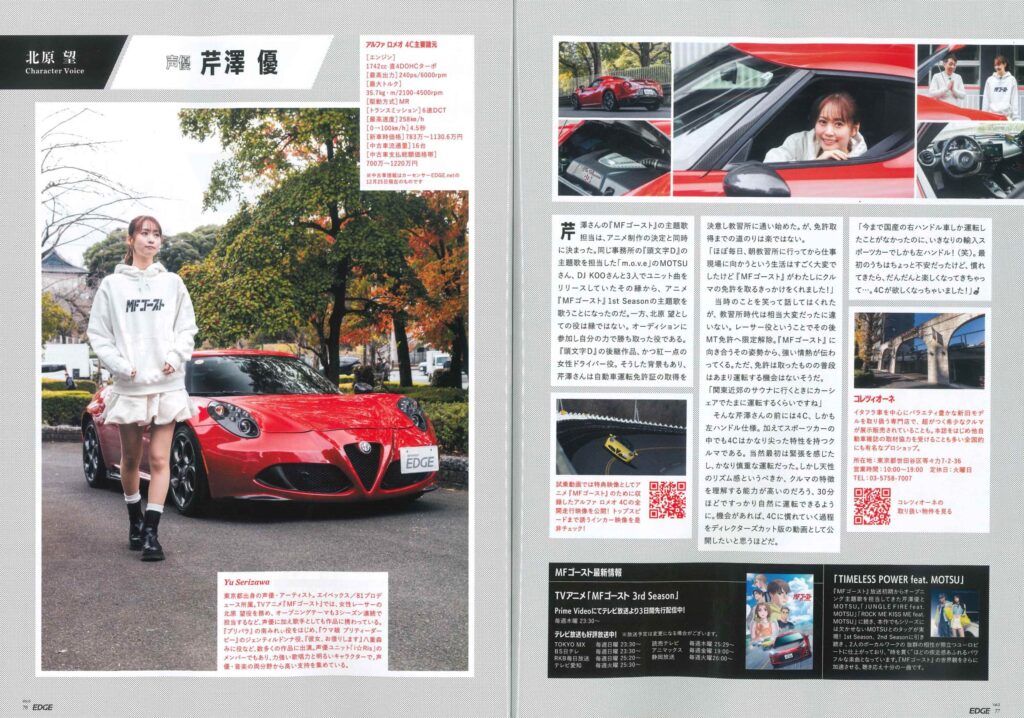 「MF GHOST on EDGE」のコーナーにて声優の芹澤優さんが弊社商品車・アルファロメオ4Cと出演しております。