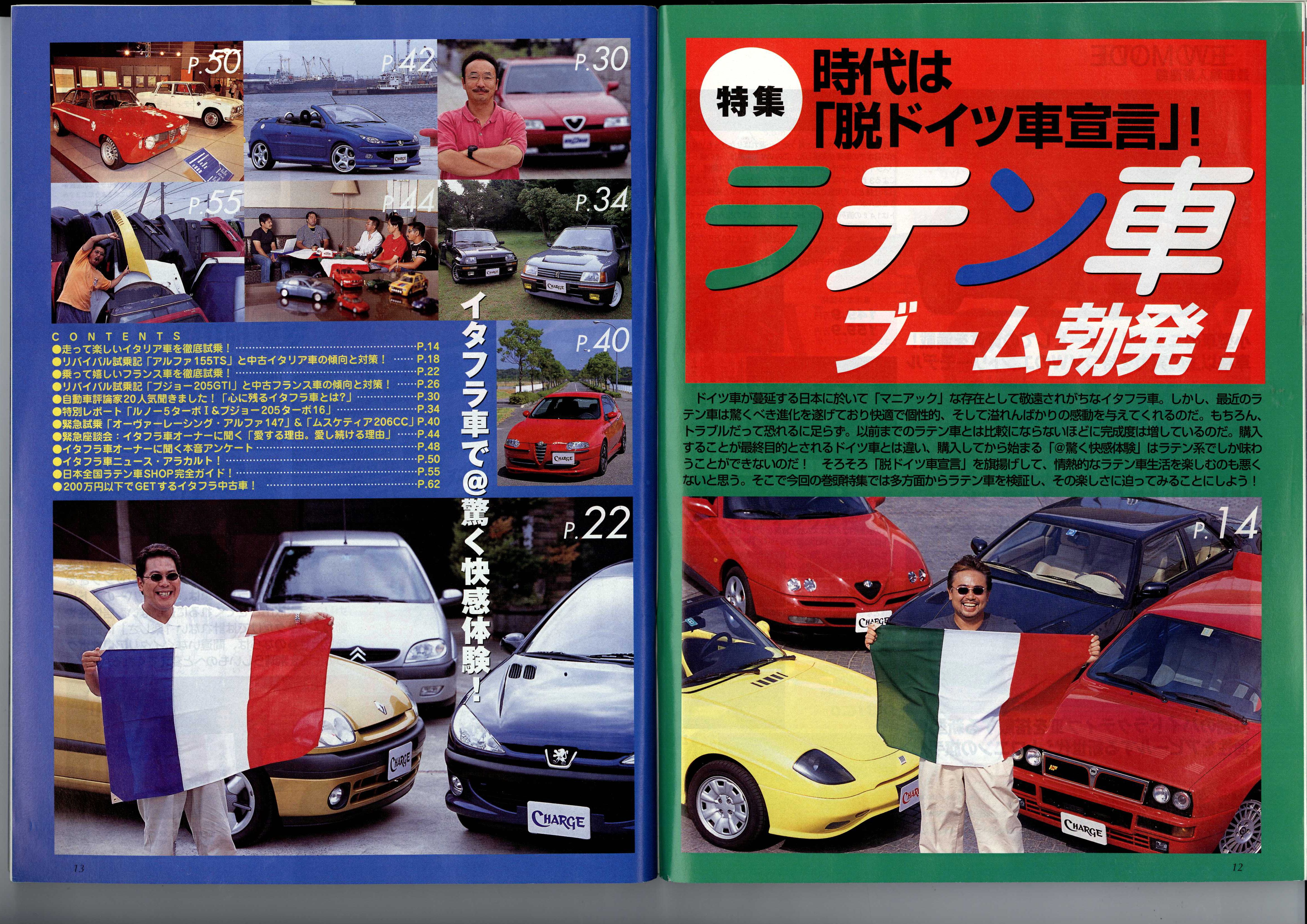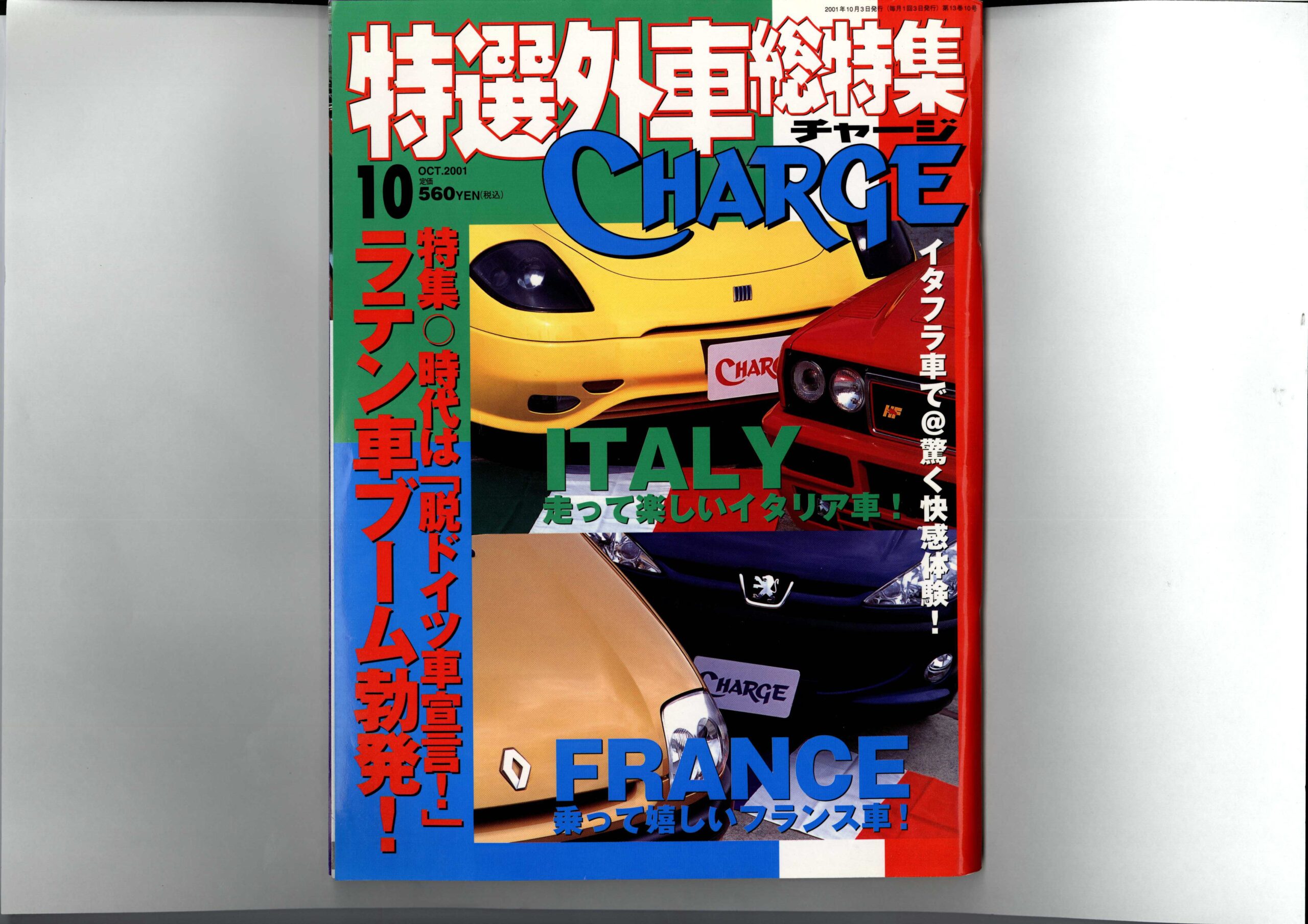 特選外車総特集CHARGEにて弊社商品車・EVOⅡ特集!! 特選外車総特集CHARGE 2001年10号 12p~17p 「ラテン車ブーム勃発!」のコーナーにて 弊社商品車・ランチアインテグラーレEVOⅡが 出演しております。