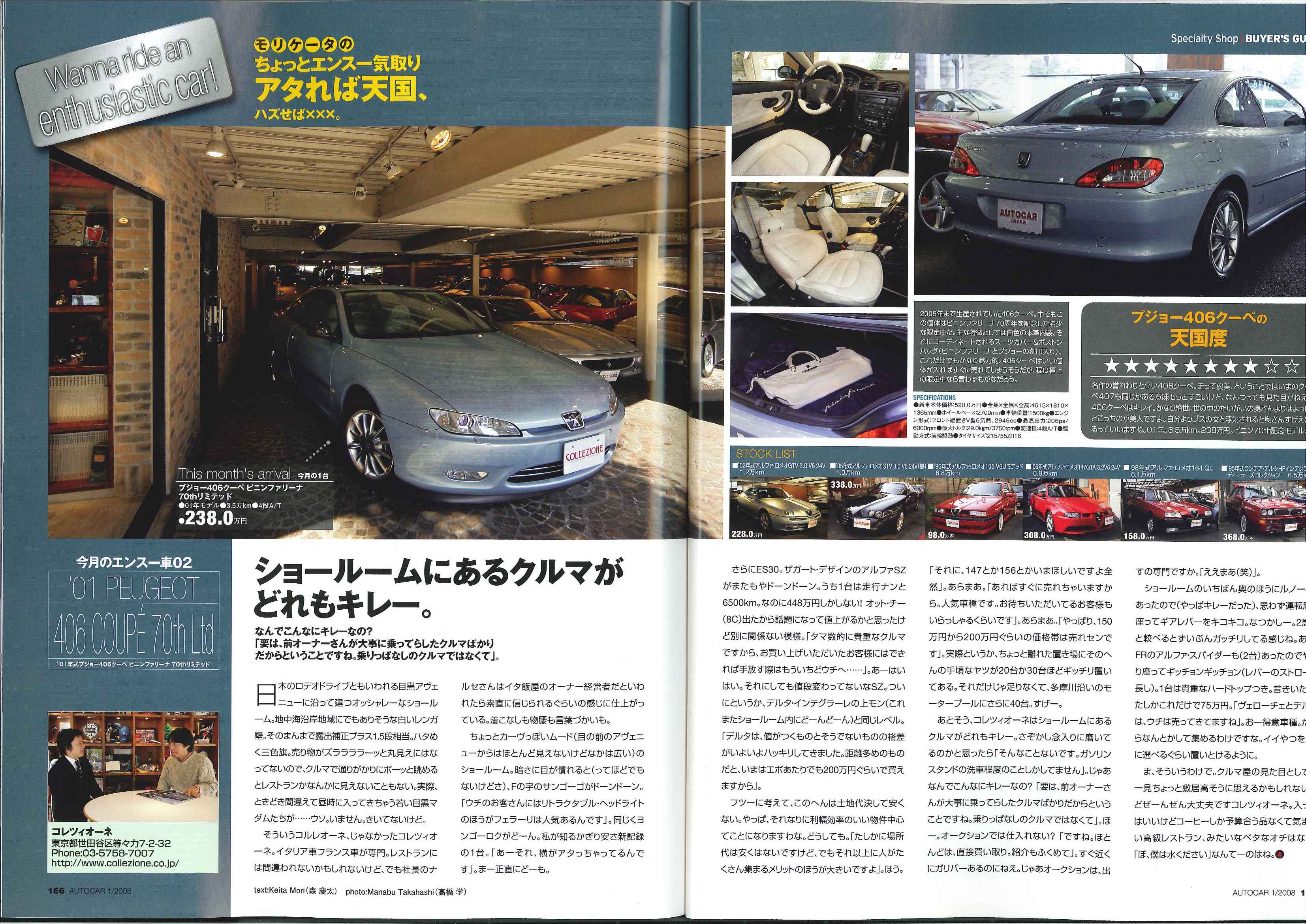 AUTOCARvol0562008.1月号 166p~167p 「ちょっとエンスー気取りアタれば天国、ハズせばxxx。」のコーナーにて取材を受けました。 プジョー406クーペピニンファリーナ70thリミテッドも出演しております!