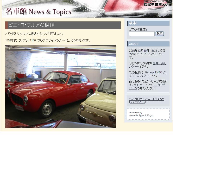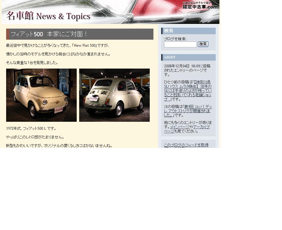 認定中古車.comの名車館にて弊社商品車・フィアット1100フルア、 フィアット500の2台が出演しております。 NEWS&DIARYをご覧下さい!! 認定中古車.com 名車館 http://www.ninteicyukosha.com/brand_top.asp?brand=meisha