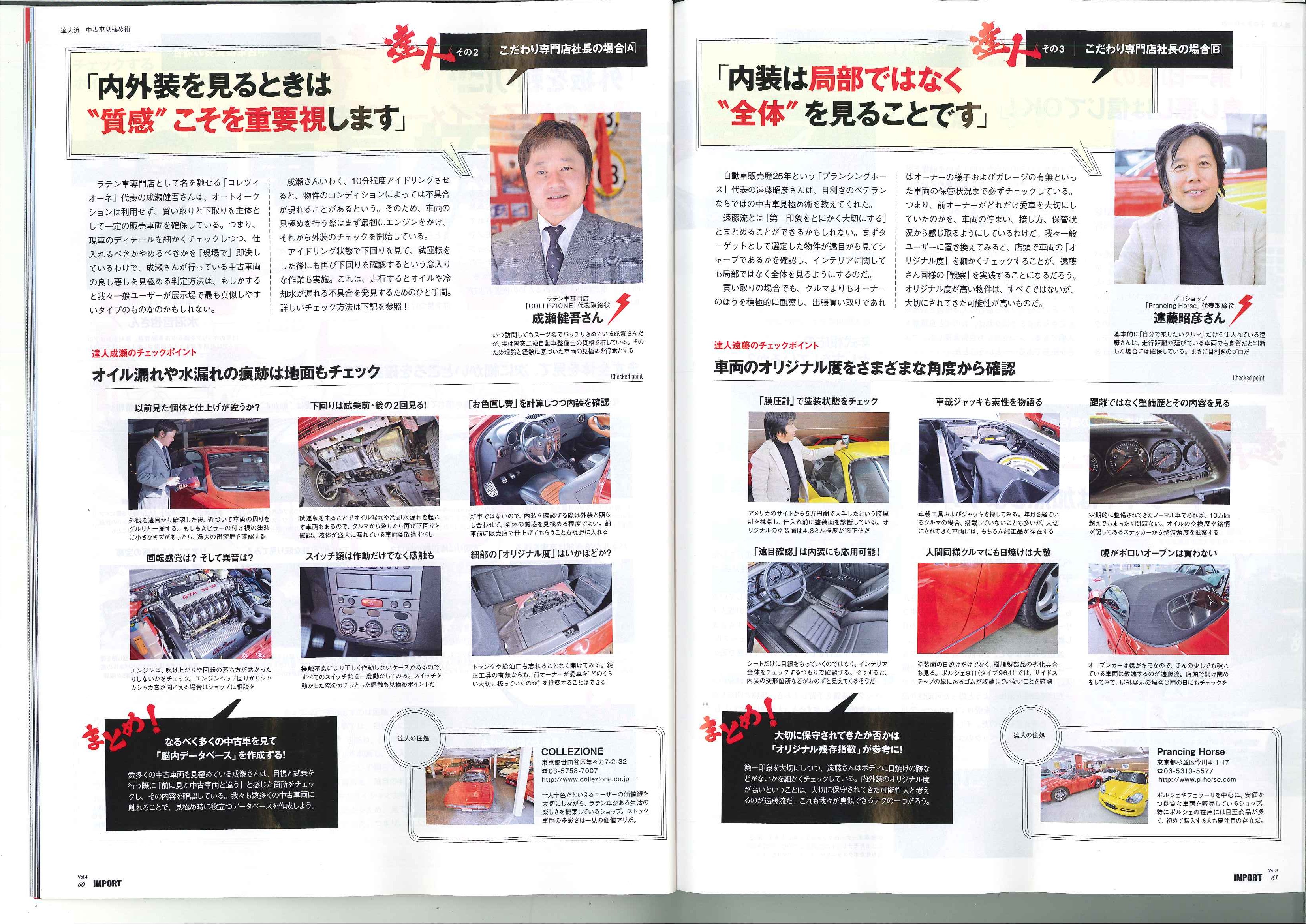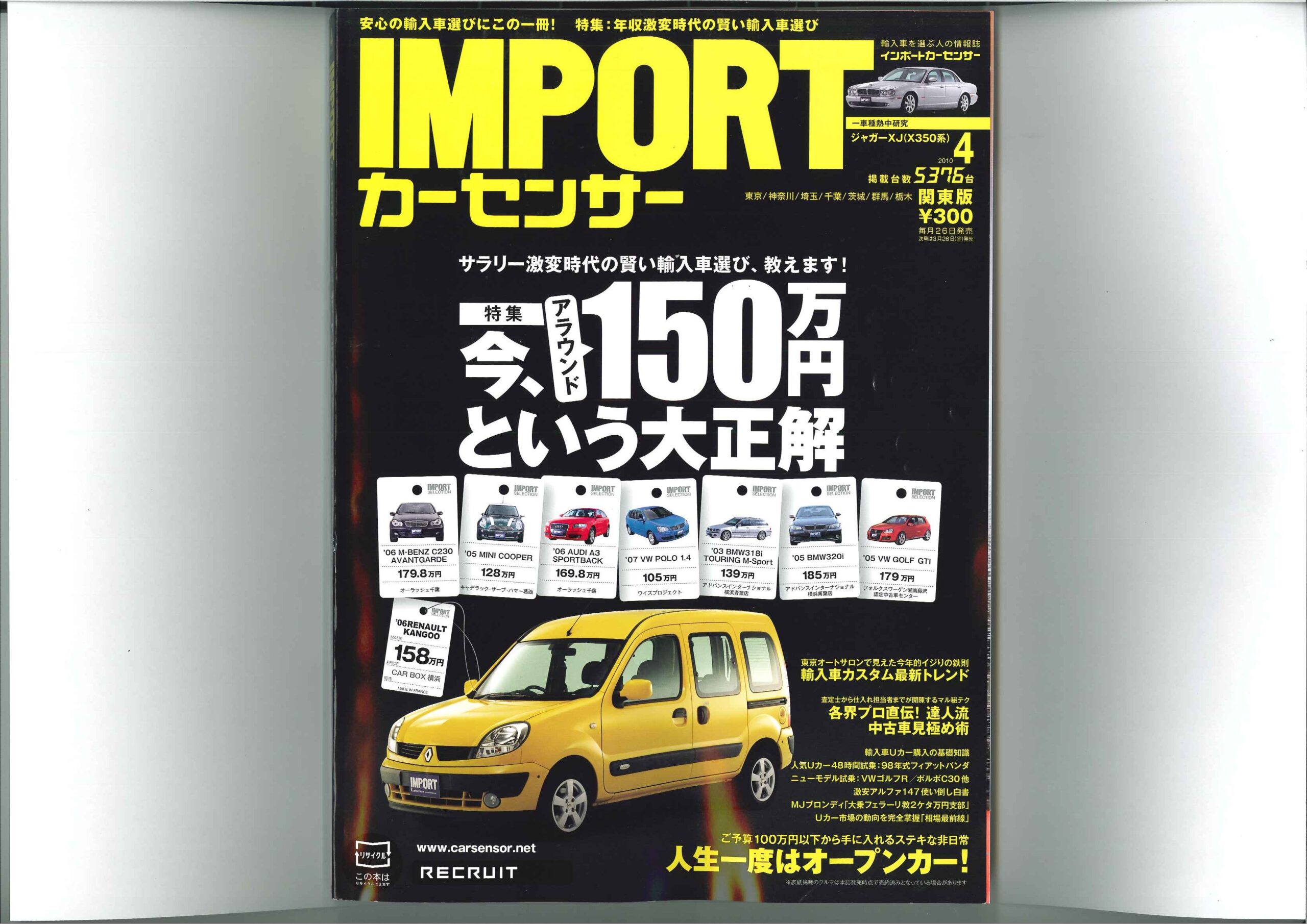 IMPORTcarsensor 2010 4月号 60p 特集「中古車見極め術」のコーナーにて取材を受けました。 中古車検査員の方や自動車評論家の西川先生、渡辺先生も語られています!