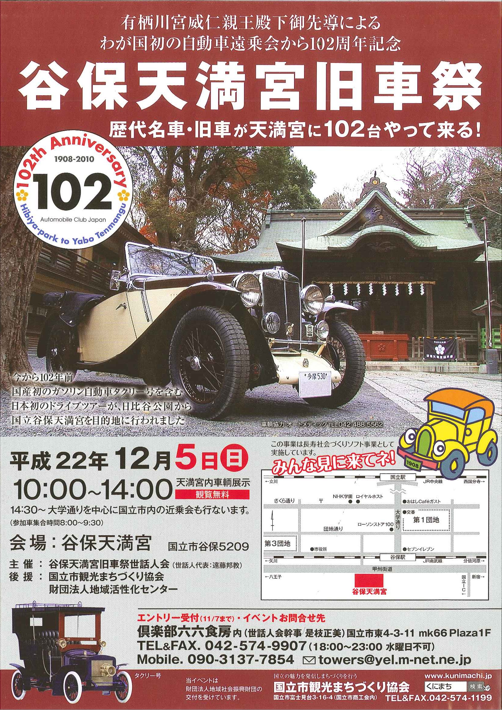 谷保天満宮旧車祭! 観覧無料です!! 日時 平成22年12月5日(日)10:00~14:00(14:30~近乗会) 会場 谷保天満宮 (東京都国立市谷保5209) 主催 谷保天満宮旧車祭世話人会 後援 国立市観光まちづくり協会 財団法人地域活性化センター