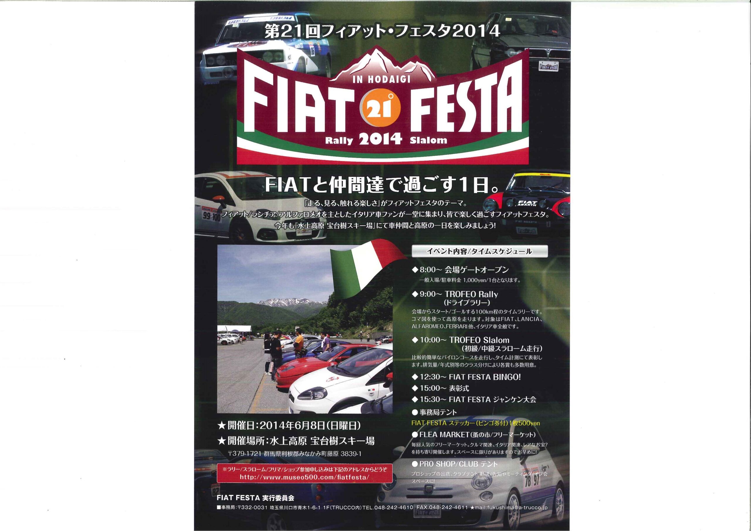 開催場所 水上高原 宝台樹スキー場 時間 8時~ 今年も「水上高原 宝台樹スキー場」にてフィアットフェスタが開催されます! 弊社にご案内パンフレットがございますので 御気軽にお申し付けください!!