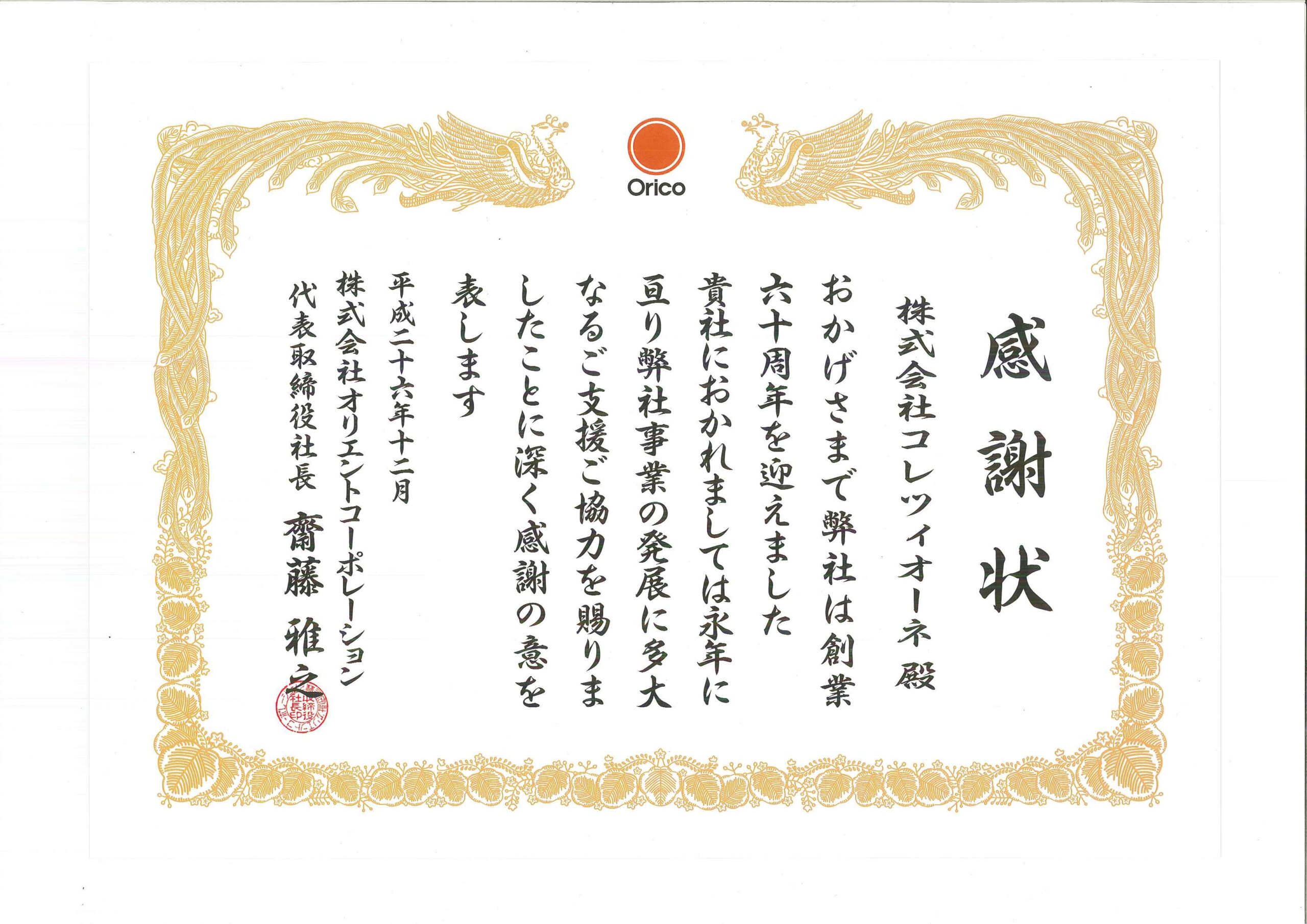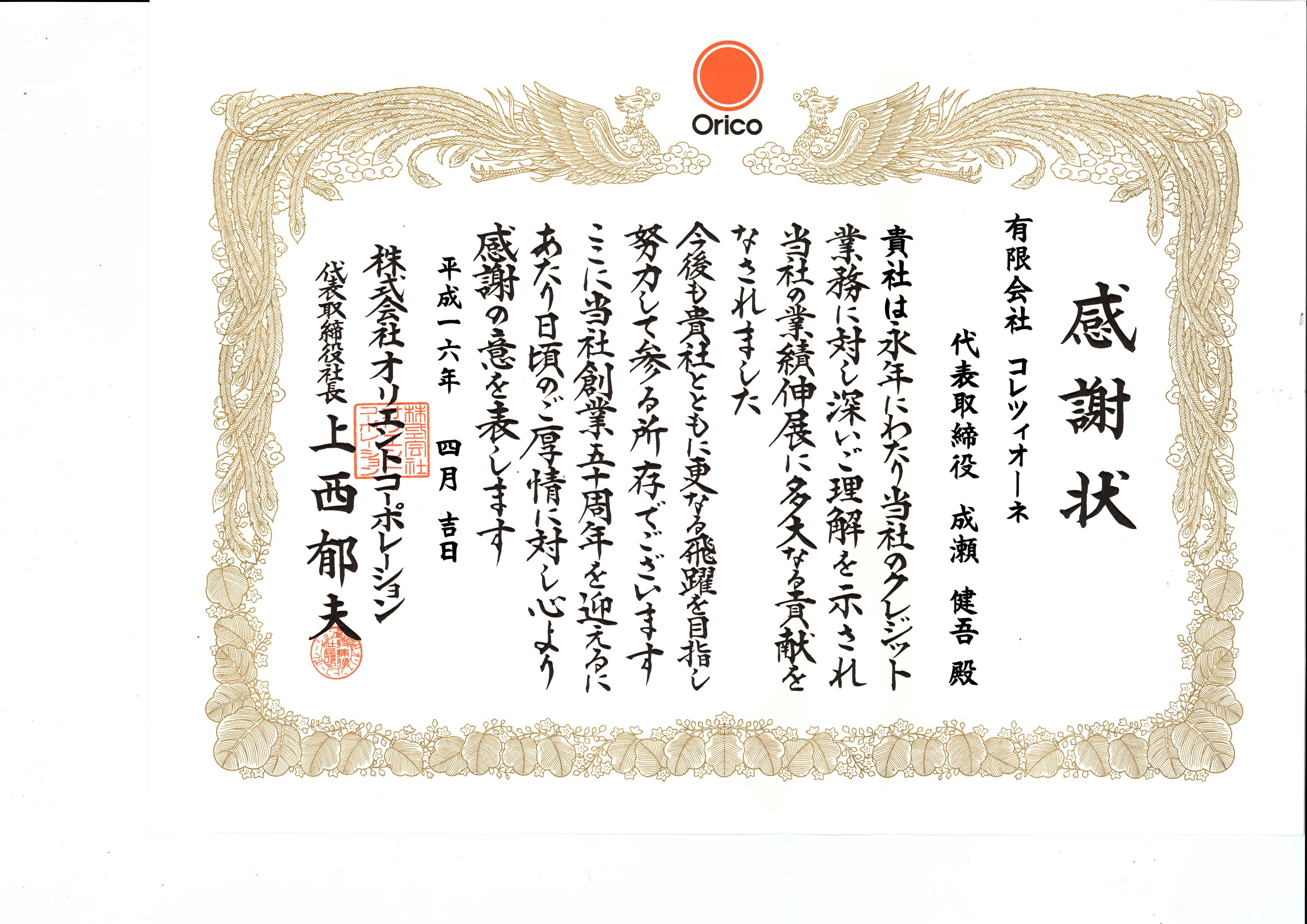 東京地区にてクレジット売り上げ高がトップクラスで 推移しており、創業60周年を記念して ㈱オリエントコーポレーション (代表取締役社長齋藤雅之)様より 感謝状を戴きました。 皆様のご愛顧、心より感謝申し上げます。