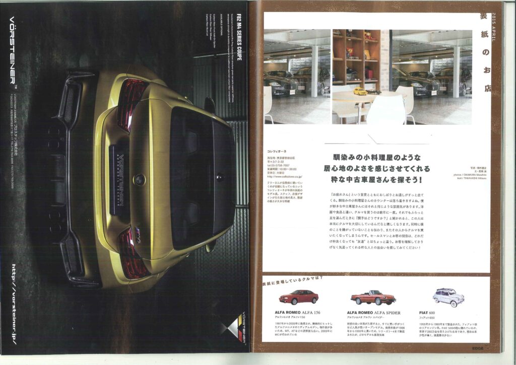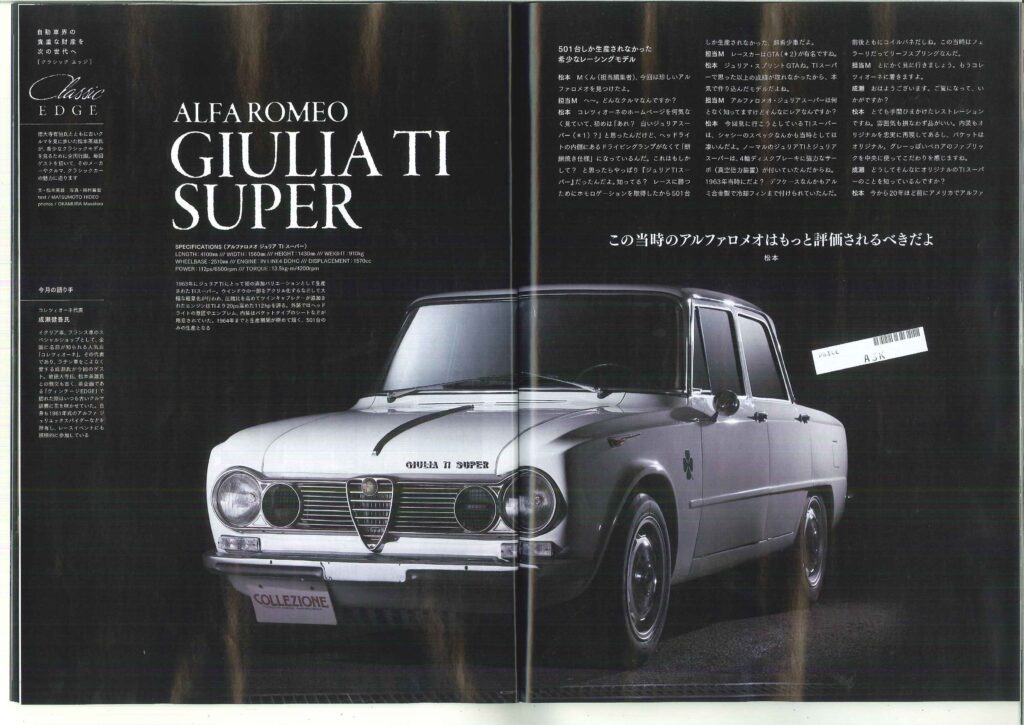 カーセンサーエッジ 2015 APR 表紙9p34p~35p38p~41p なんと今月号の表紙は弊社で撮影が行われ テリー伊藤さんと弊社商品車が共演しております! テリーさんありがとうございました!!! 「classicedge」(クラシックエッジ)にて取材を受けました! 弊社商品車・アルファロメオジュリアTIスーパーも出演しております!!
