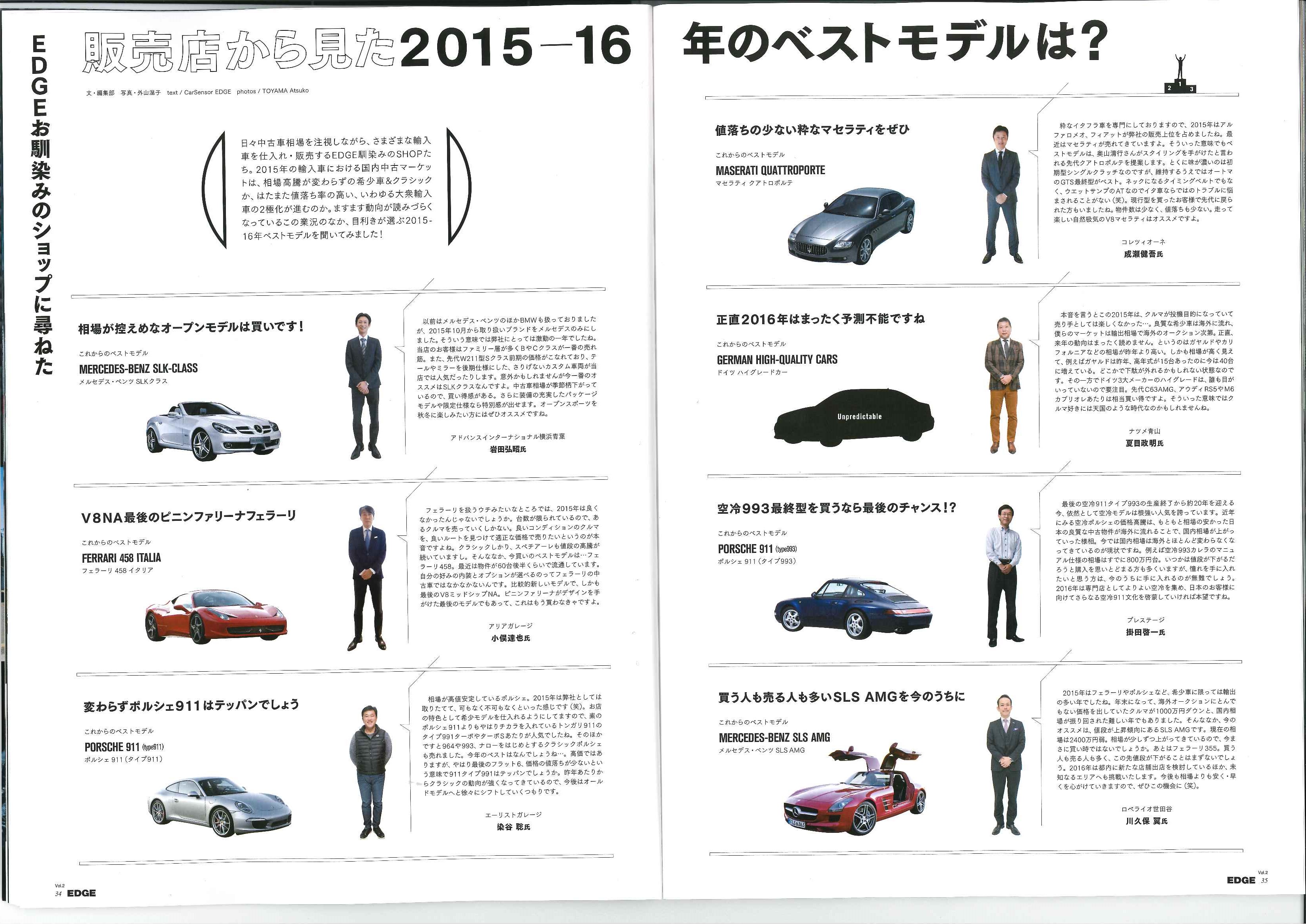 カーセンサーエッジ 2016 FEB 34p~35p 毎年恒例のエッジ・オブ・ザ・イヤーにてEDGEお馴染みのショップに尋ねた「販売店から見た2015-16年のベストモデルは?」のコーナーで取材を受けました!