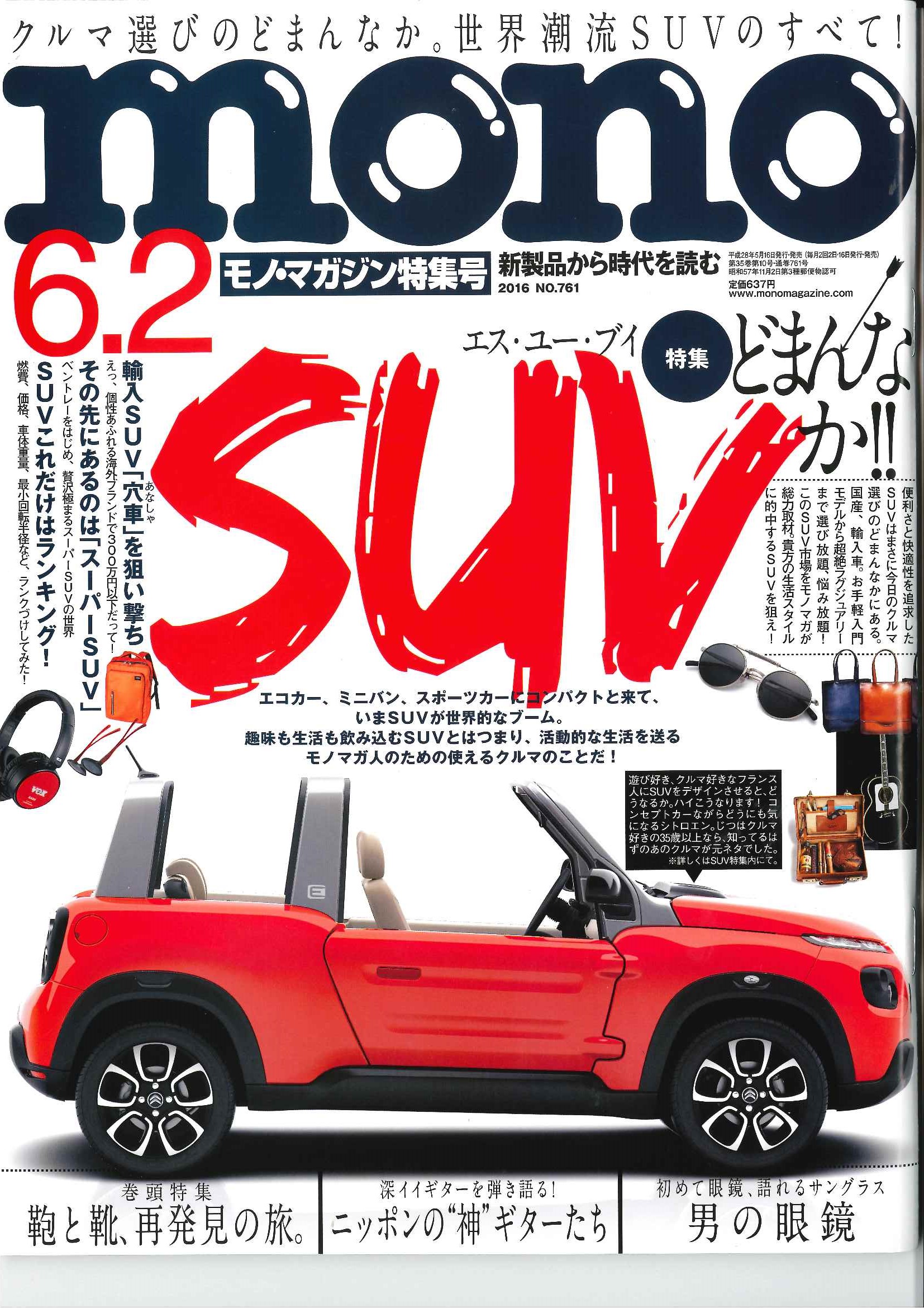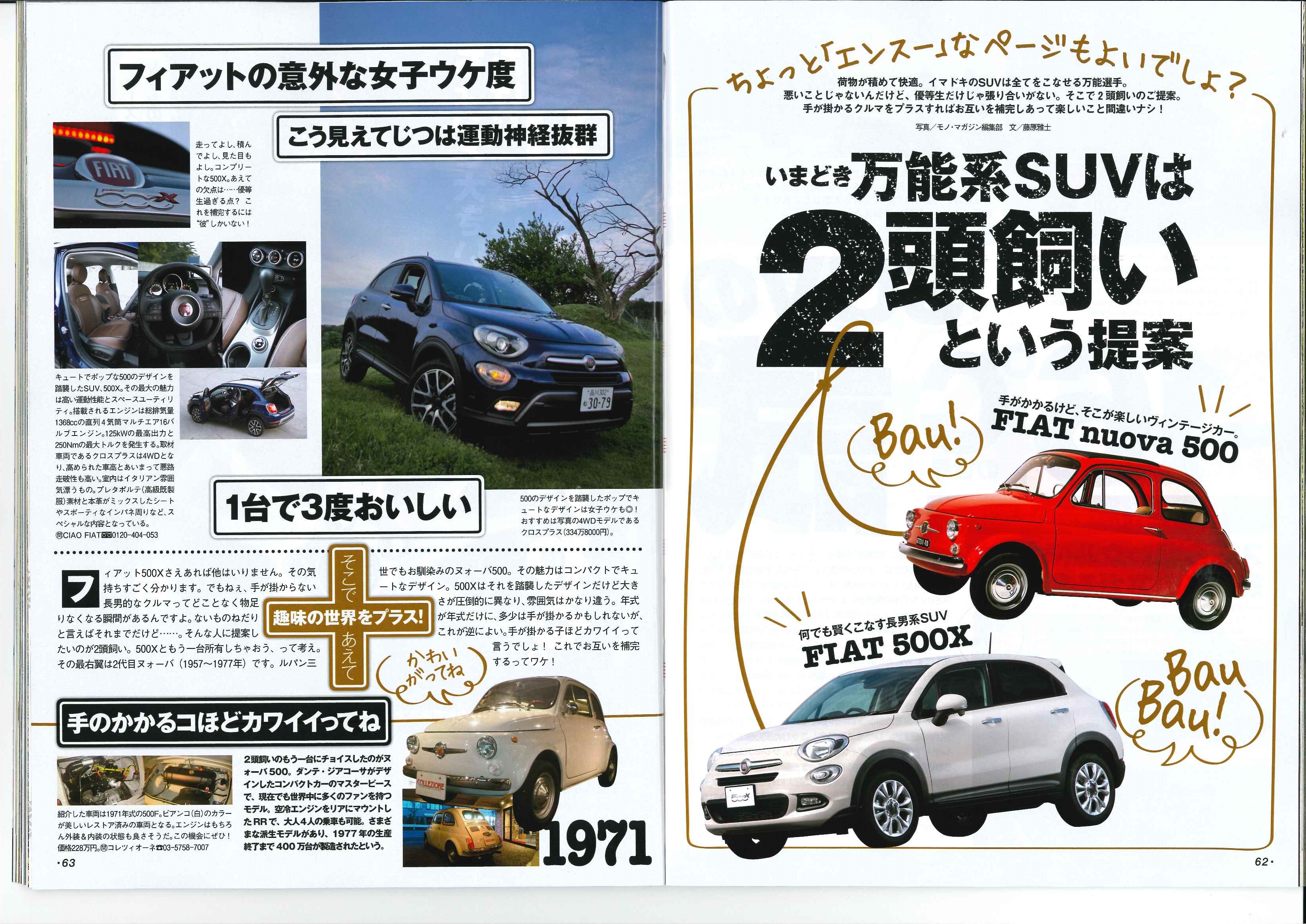 モノ・マガジン(特集号) 2016 NO.761 62P~63P 「いまどき万能系SUVは2頭飼いという提案」 というコーナーにて弊社商品車・フィアット500が 出演しております!!