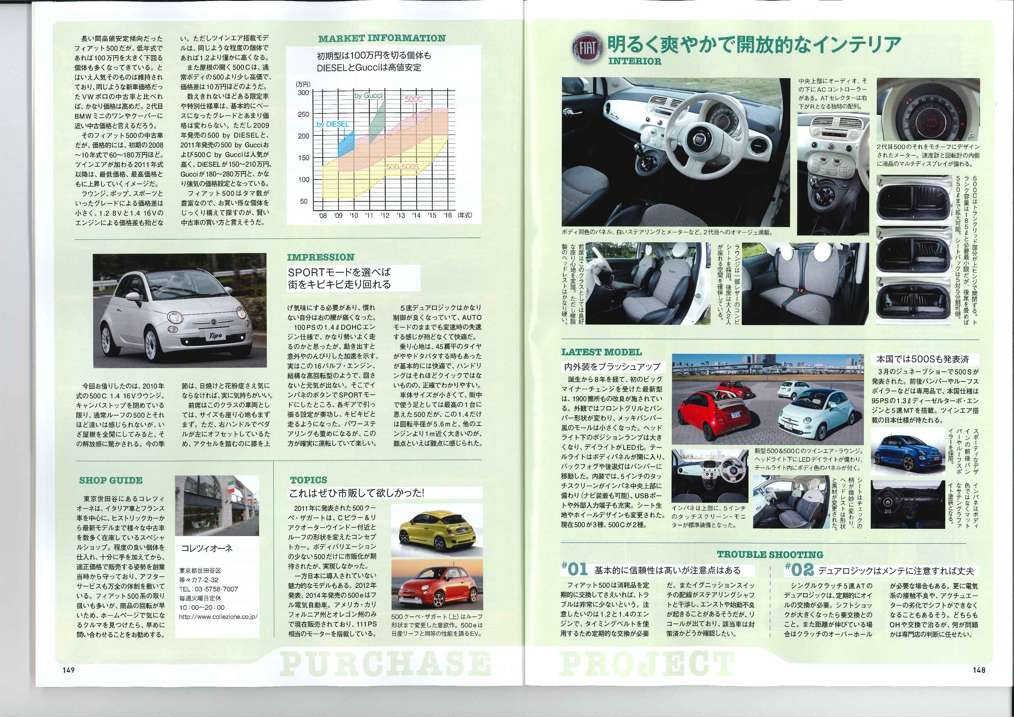 145p~149p PurchaseProjectのコーナーにて取材を受けました!! 弊社商品車・フィアット500が 5ページにわたり出演しております!