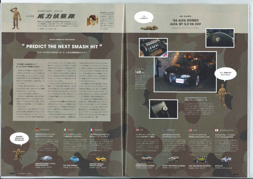 表紙 6p~7p 35p 54p~55p 86p 弊社商品車・ランチアデルタインテグラーレ コレッツィオーネ がなんと表紙に登場です!! TreasureHuntingのコーナーにて本誌デスクが弊社商品車・ランチアインテグラーレEVOⅠをお宝車として選定していただきました! また、中古車相場威力偵察隊のコーナーにて弊社商品車・アルファロメオGTが出演しております!! そして、第62回自動車暴論のコーナーにて取材を受けました!!