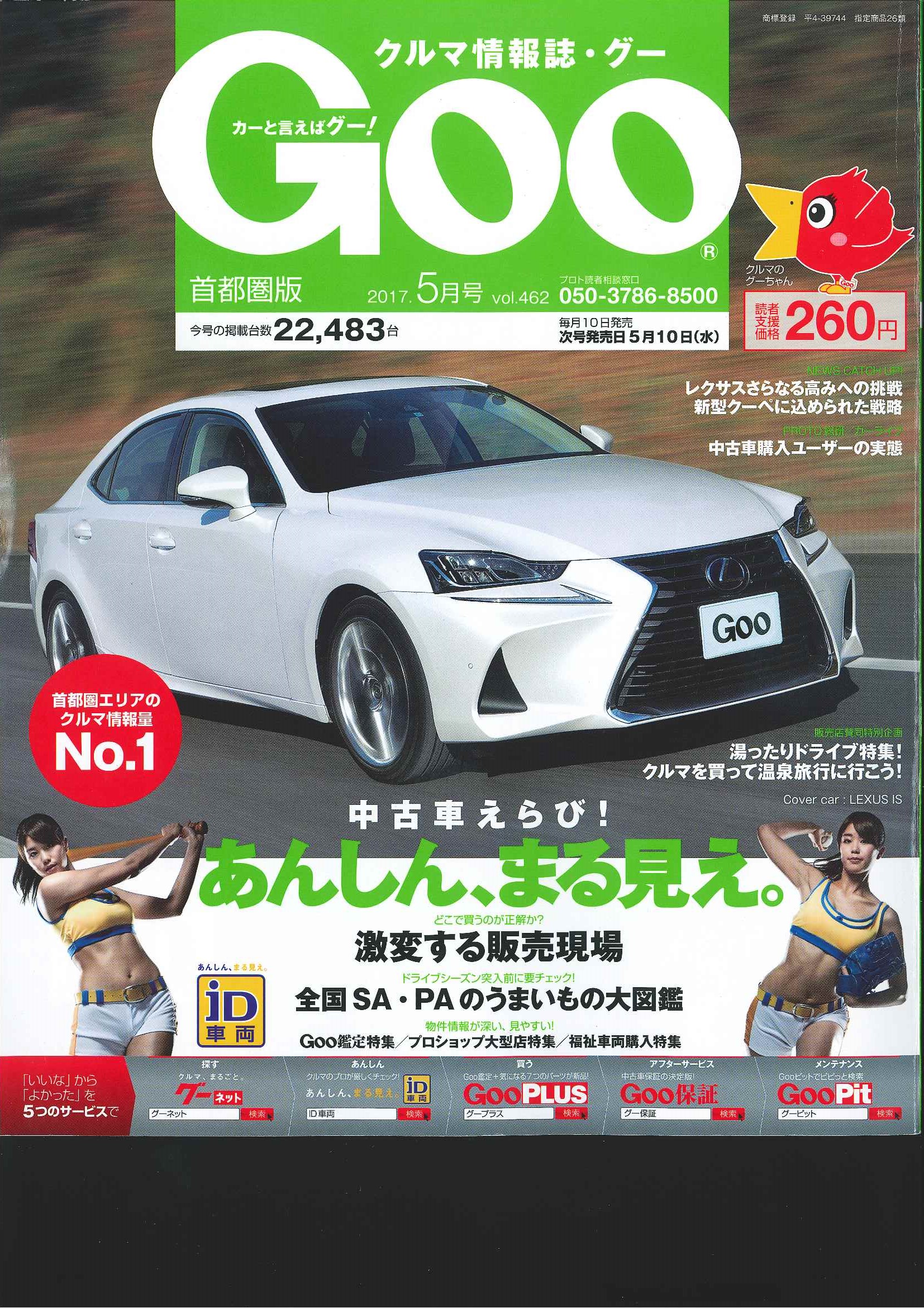 クルマ情報誌・グー 2017.5月号 vol.462 首都圏版 20P 巻頭特集 どこで買うのが正解か? 「激変する販売現場。」のコーナーにて 取材を受けました!! 特集ではインターネット通販から個人売買まで 細かく解説されています! これからお車のご購入をご検討されている方は 是非、ご参考にしてください!!
