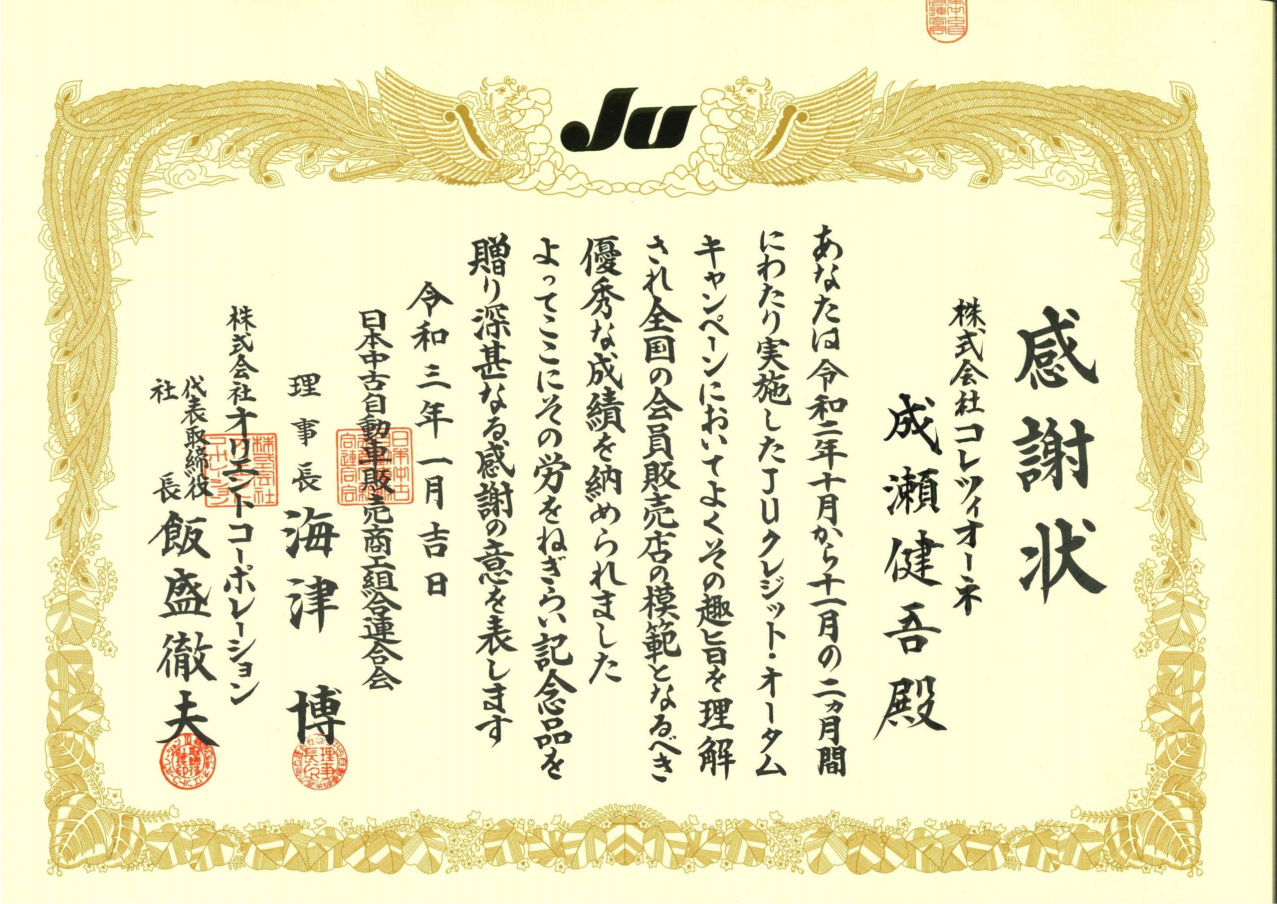 オートローン取扱額が全国トップクラスで推移し JU中販連(日本中古自動車販売商工組合連合会)様、 ㈱オリエントコーポレーション様より 表彰されました。 これもひとえに、このような時期の中 弊社をご利用頂いている皆様のおかげであり 心より感謝申し上げます。 今後共、末永くご愛顧のほど 何卒宜しくお願い申し上げます。