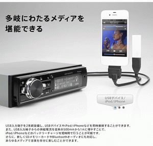iPhoneなどは、背面のUSB(しかも2つ装備されてる!)にケーブルをただ繋ぐだけなので非常に簡単。この黒いケーブルこそ別売りなものの、ダッシュでの目立ち具合を考えるとむしろApple純正の白よりも好ましい。