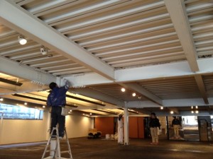 商談スペースの天井ペイントなど、営業しながらの工事でしたので
