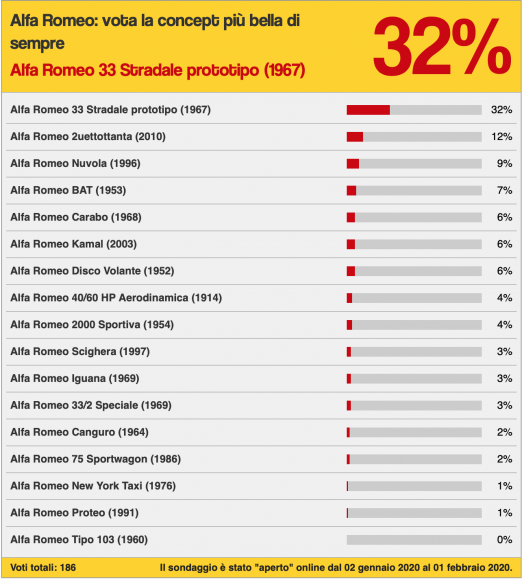 そんなアルファロメオの歴代コンセプトカーで「どれが一番美しいか」選手権が開かれた。もちろんイタリアのメディア主催だ。まあ、それだけイタリア人はクルマを愛しているという証拠なのだろう。(投票総数186票というのはご愛嬌)